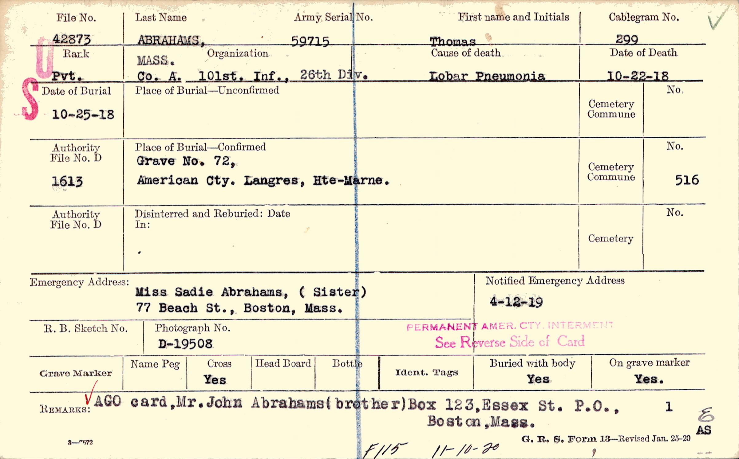 Miss Sadie Abrahams, (Sister), 77 Beach St., Boston, Mass.