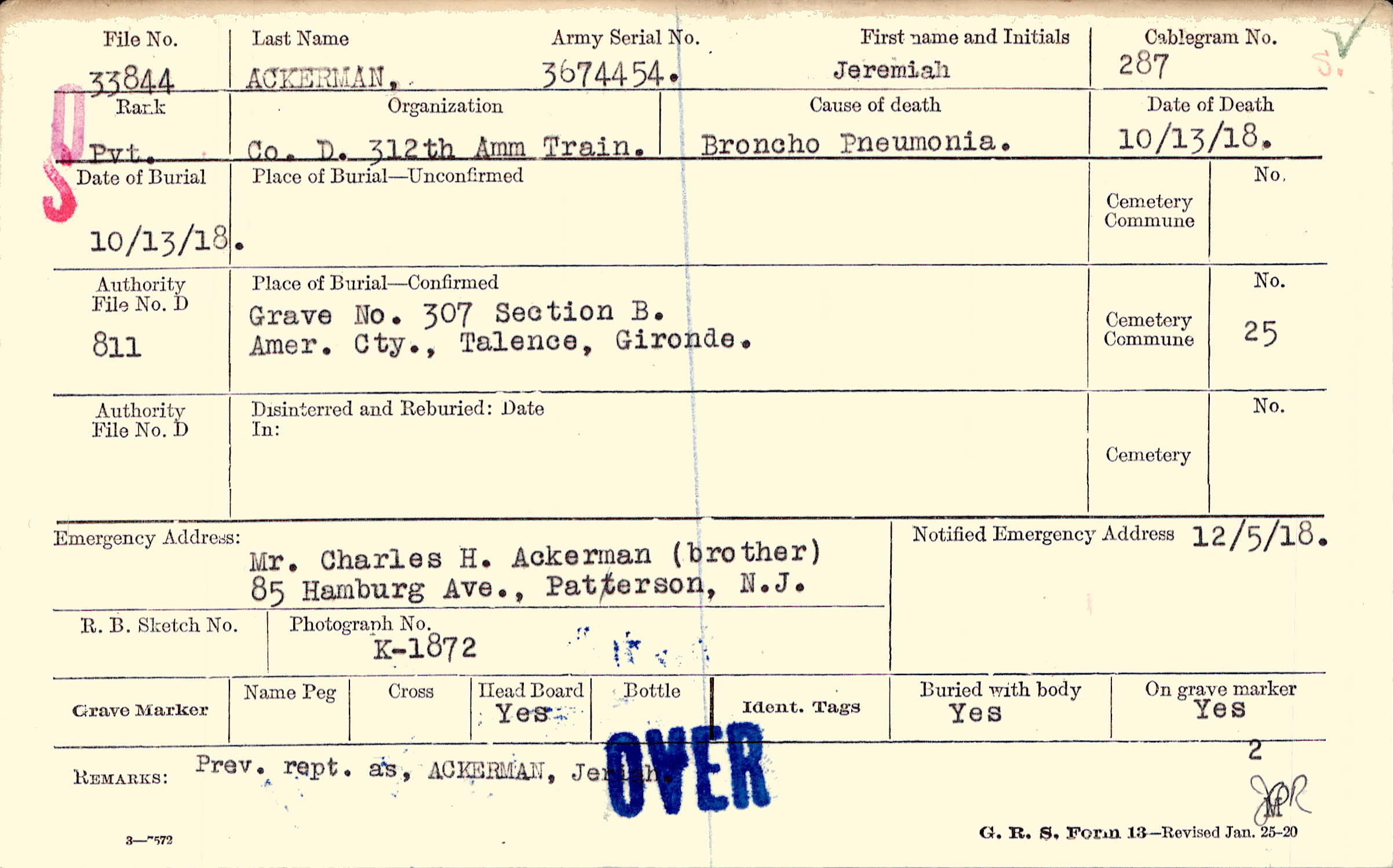 Mr. Charles H. Ackerman (brother), 85 Hamburg Ave., Patterson, N.J.