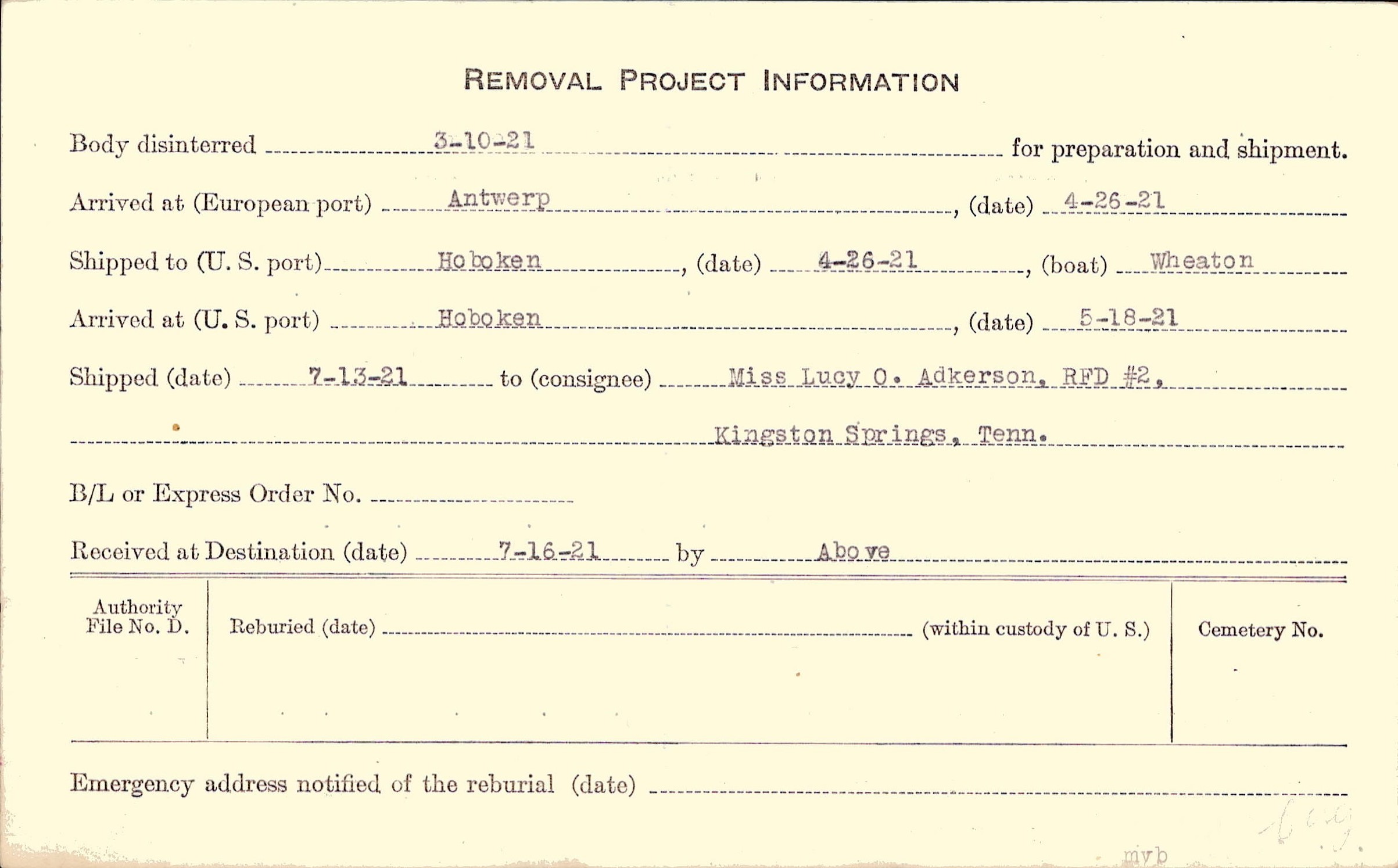 Body disinterred 3/10/1921 for preparation and shipment.