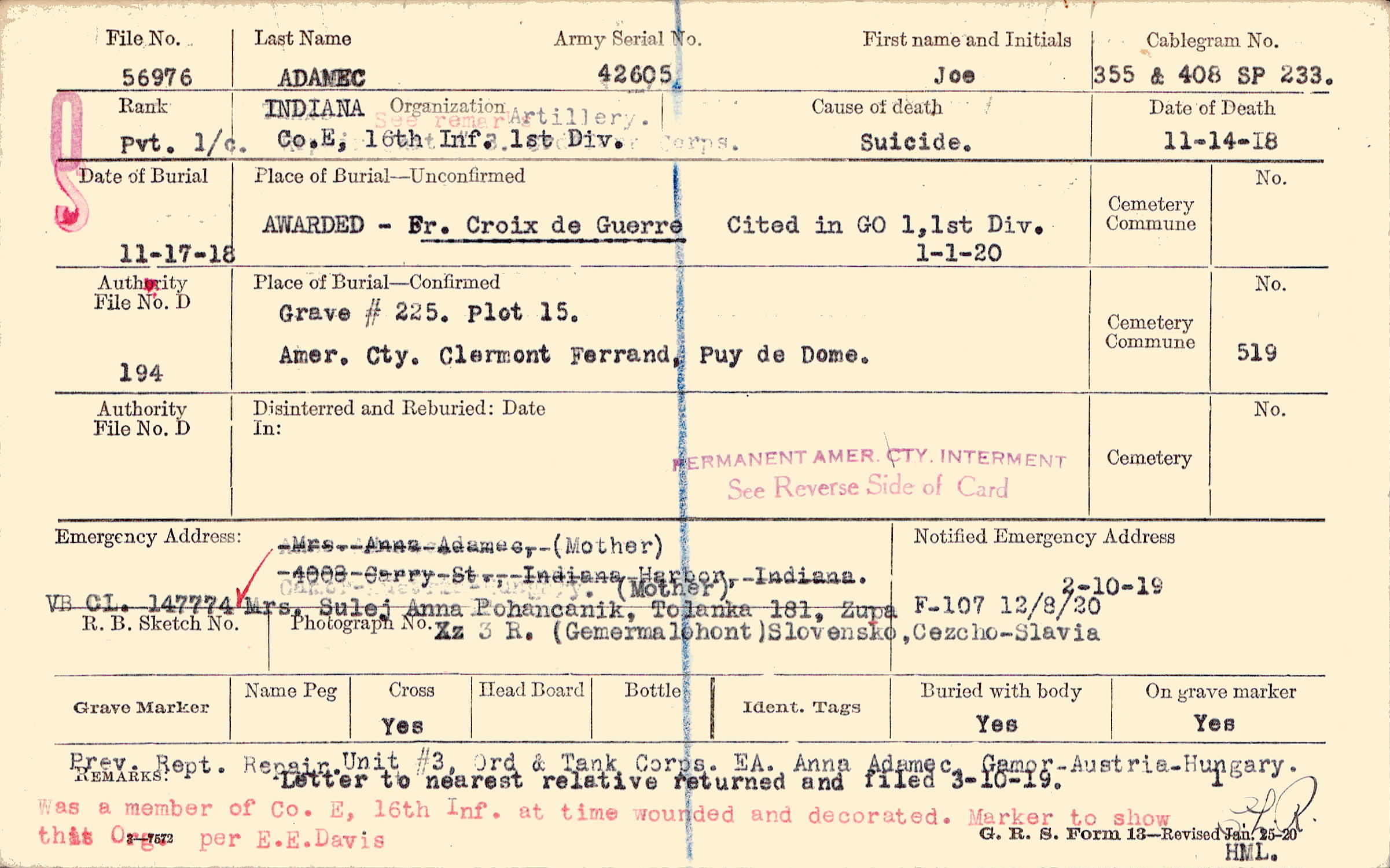 Prev. Rept. Repair. Unit #3, Ord & Tank Corps. EA. Anna Adamec, Gamor-Austria-Hungary. Letter to nearest relative returned and filed 3-10-19. Was a member of Co. E, 16th Inf. at time wounded and decorated. Marker to show this Org. per E.E. Davis