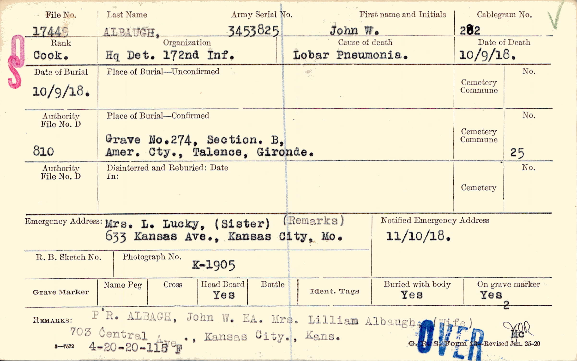 P. R. ALBAGH, John W. EA. Mrs. Lilliam Albaugh, (Wife), 703 Central Ave., Kansas City., Kans.