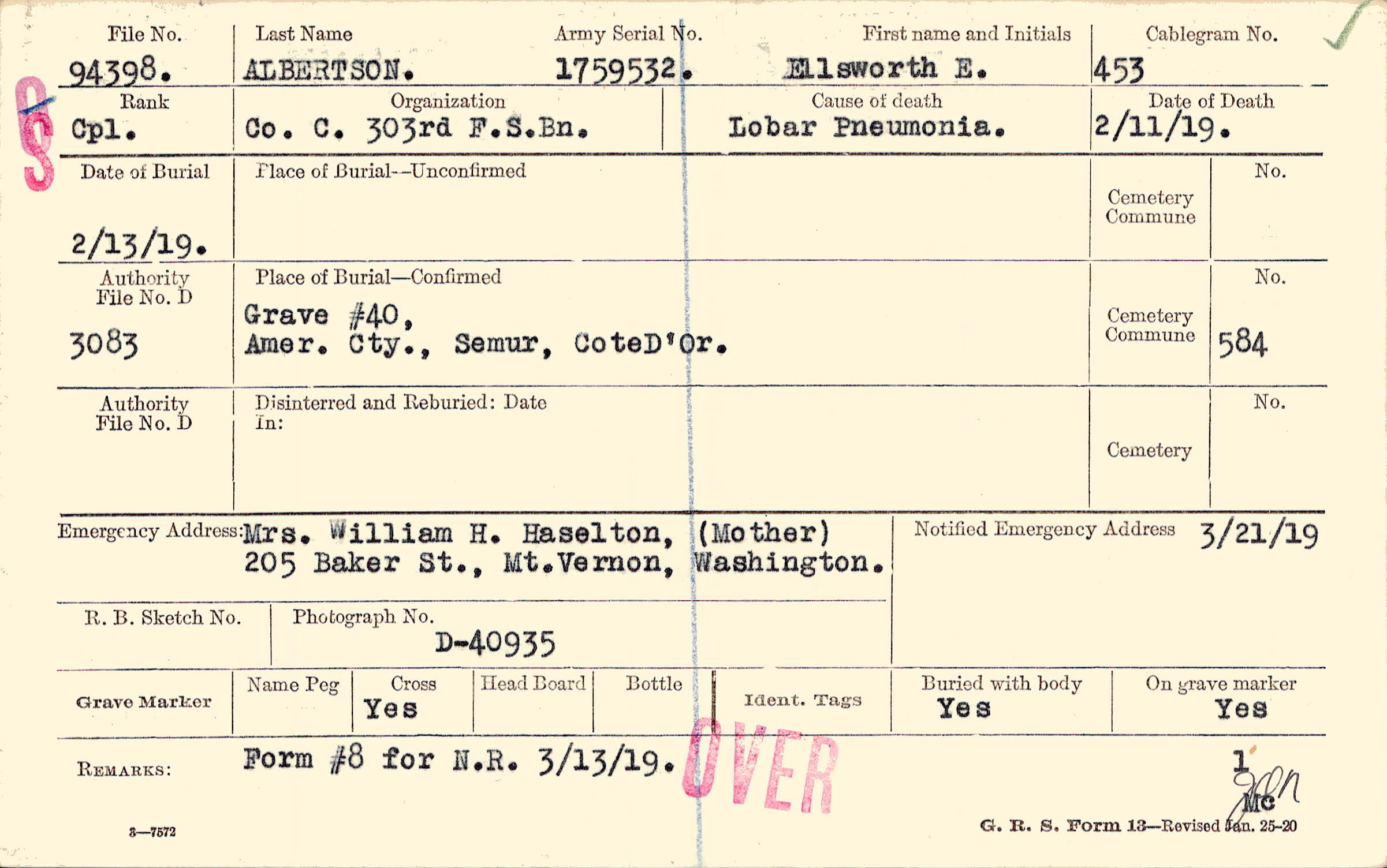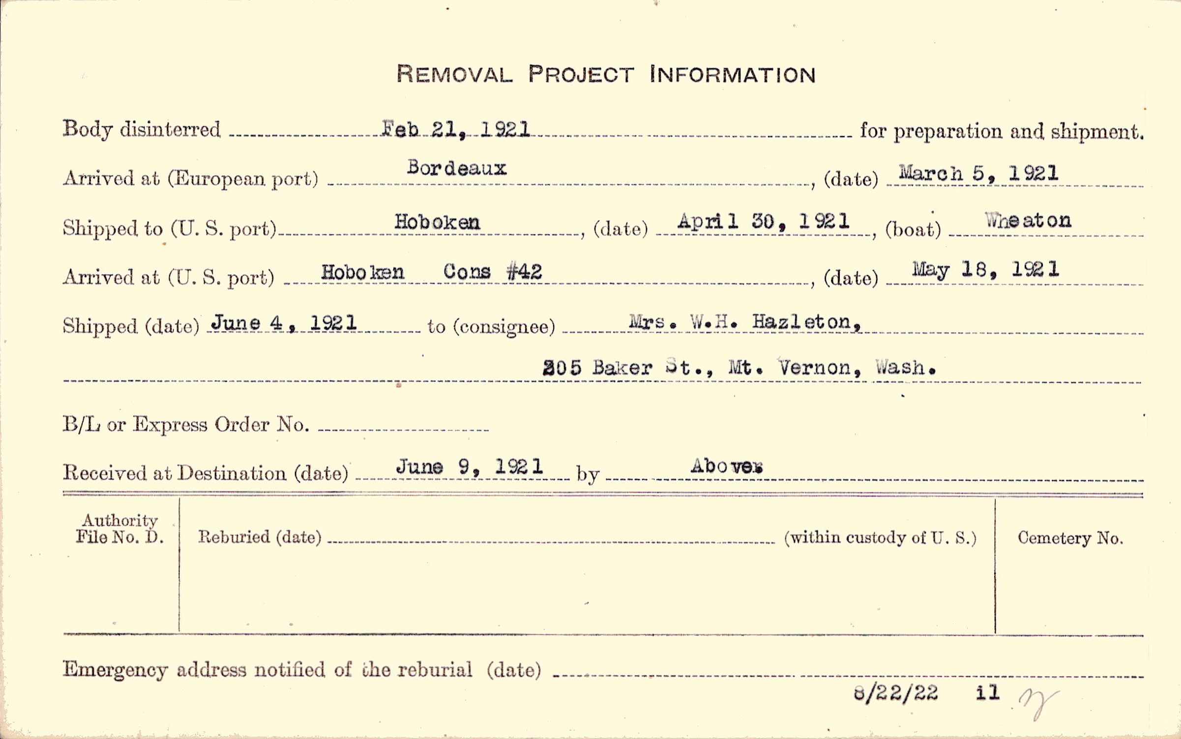 Mrs. William H. Haselton, (Mother), 205 Baker St., Mt. Vernon, Washington.