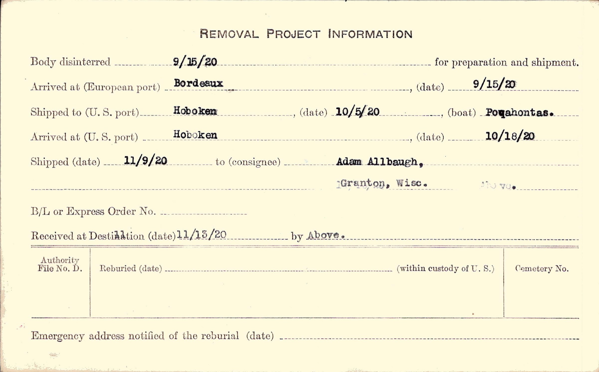 Body disinterred 9/15/1920 for preparation and shipment.