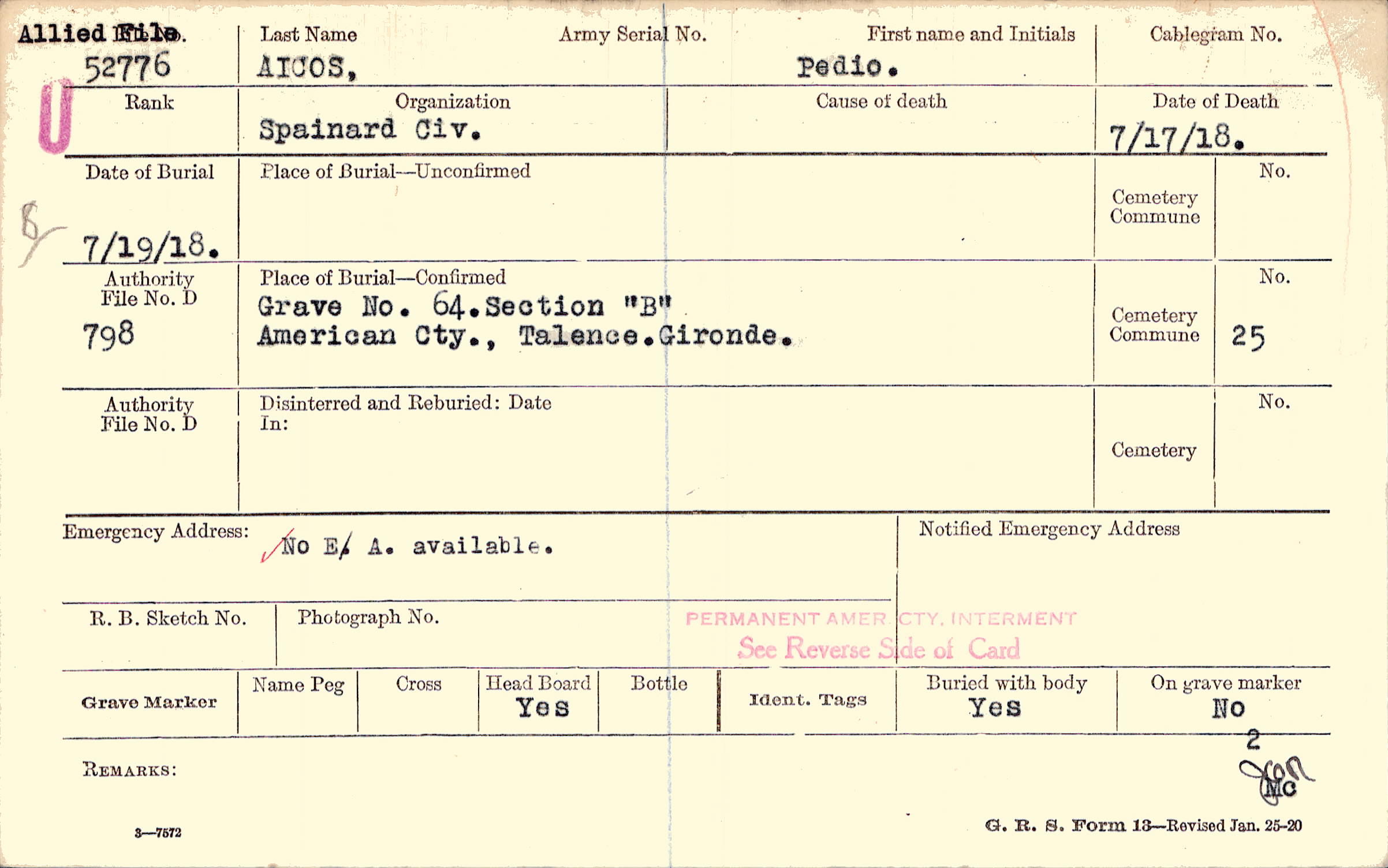 Grave 64, Section "B", American Cty., Talence, Gironde.