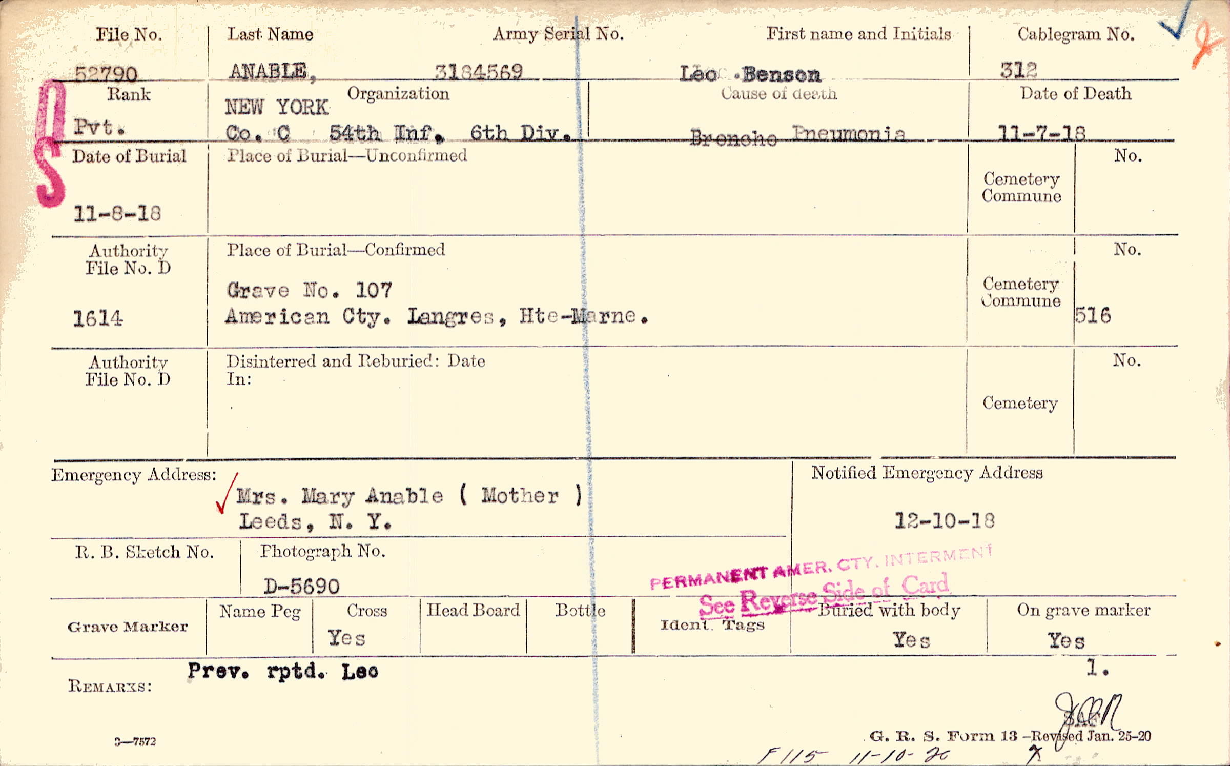 Grave 107, American Cty., Langres, Hte-Marne.,