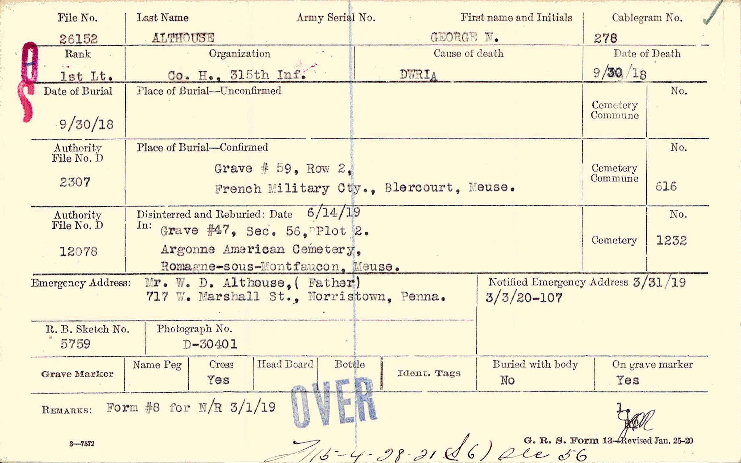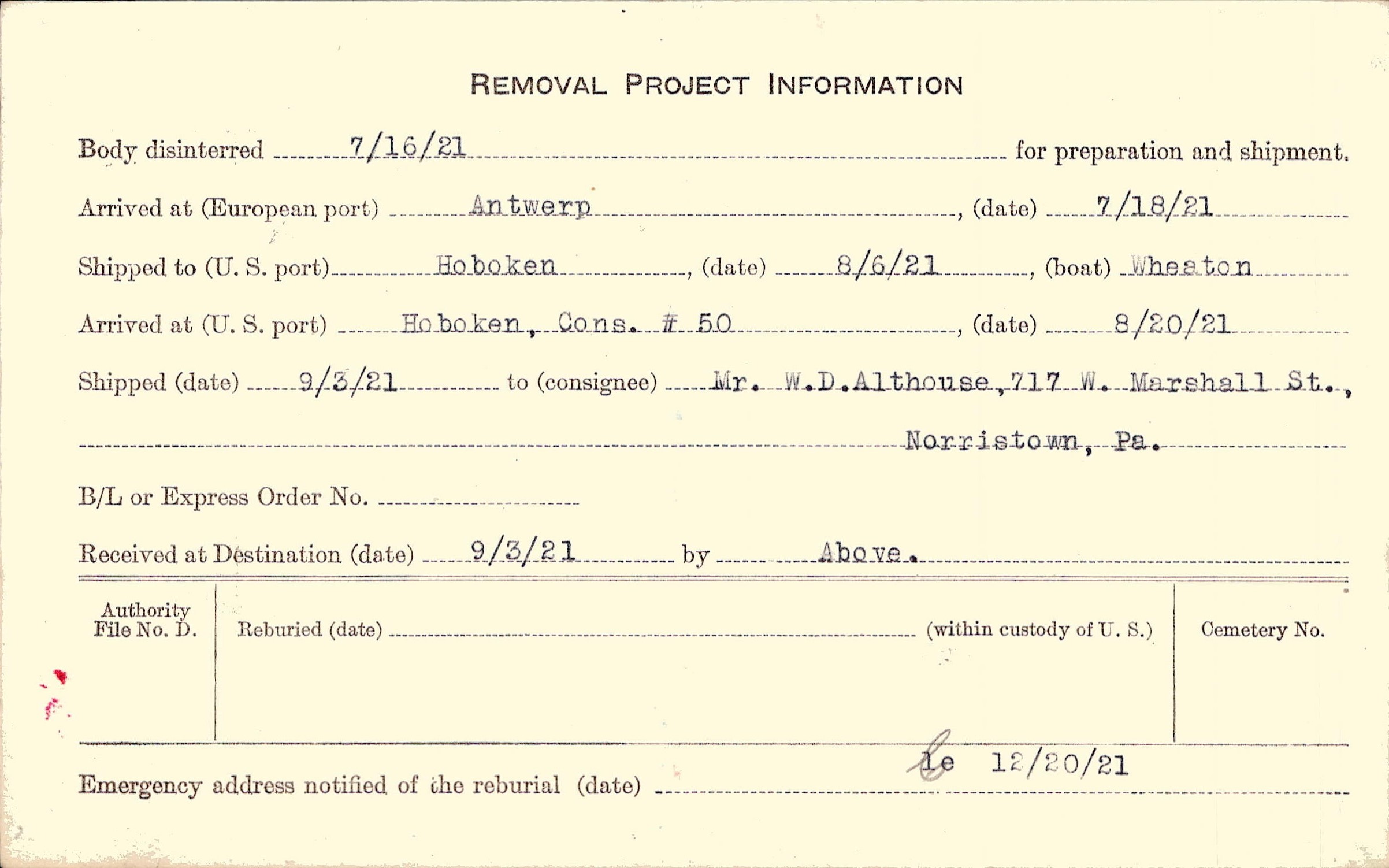 Mr. W.D. Althouse, (Father), 717 W. Marshall St., Norristown, Penna.