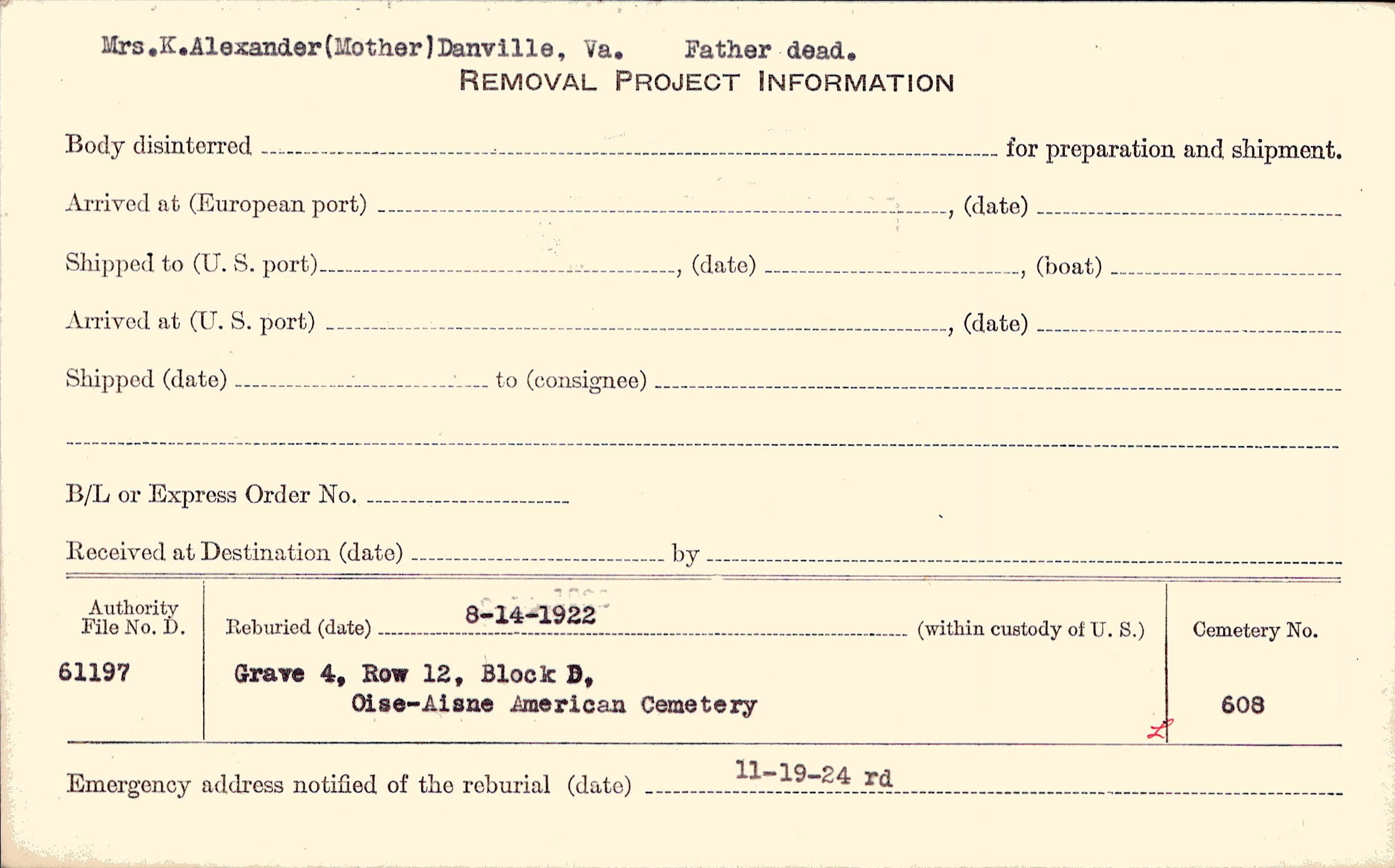 Mrs. K. Alexander (Mother), Danville, Va. Father dead. |