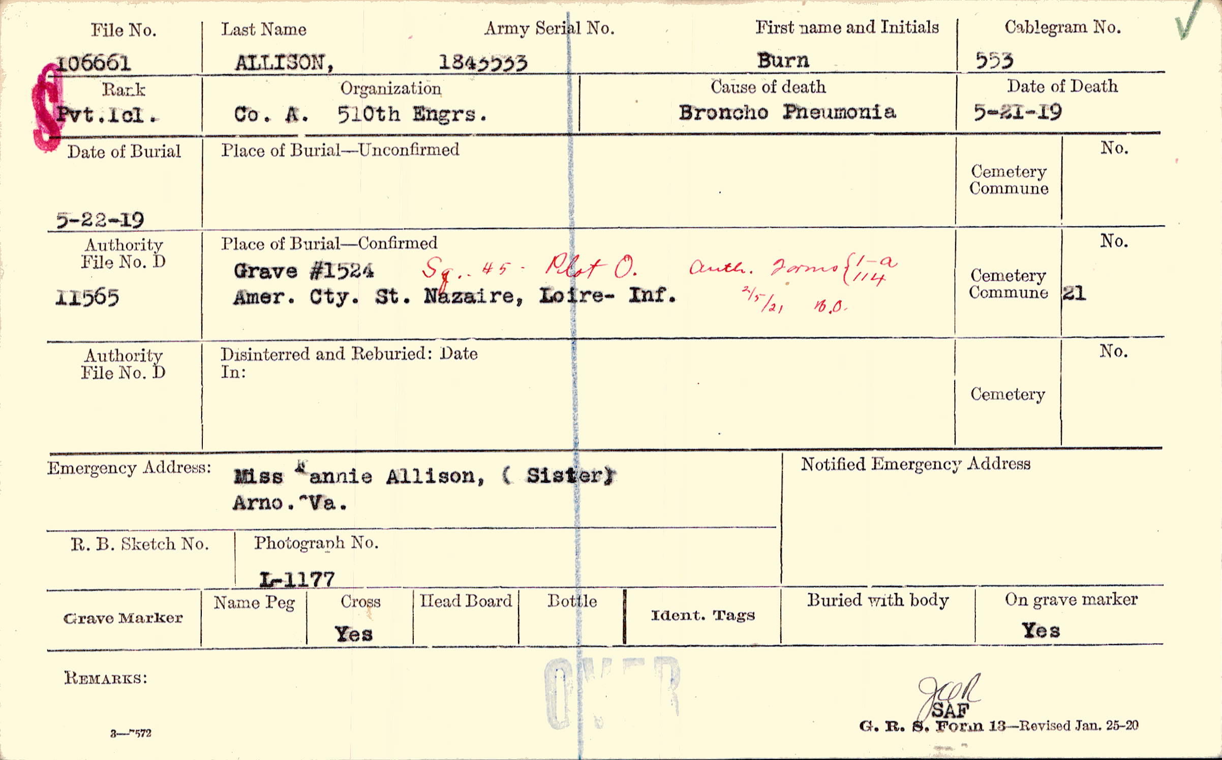 Grave #1524, Sq. 45, Plot O., Amer. Cty., St. Nazaire, Loire-Inf.