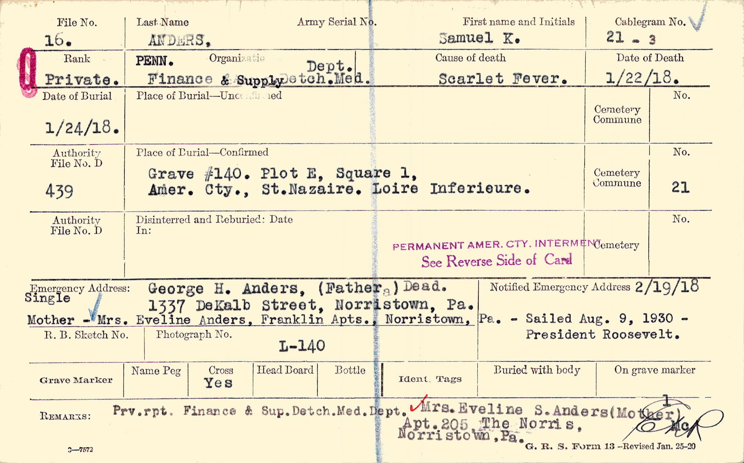 George H. Anders, (Father), 1337 DeKalb Street, Norristown, Pa., Dead. Single Mother - Mrs. Eveline Anders, Franklin Apts., Norristown, Pa. - Sailed Aug. 9, 1930 - President Roosevelt.