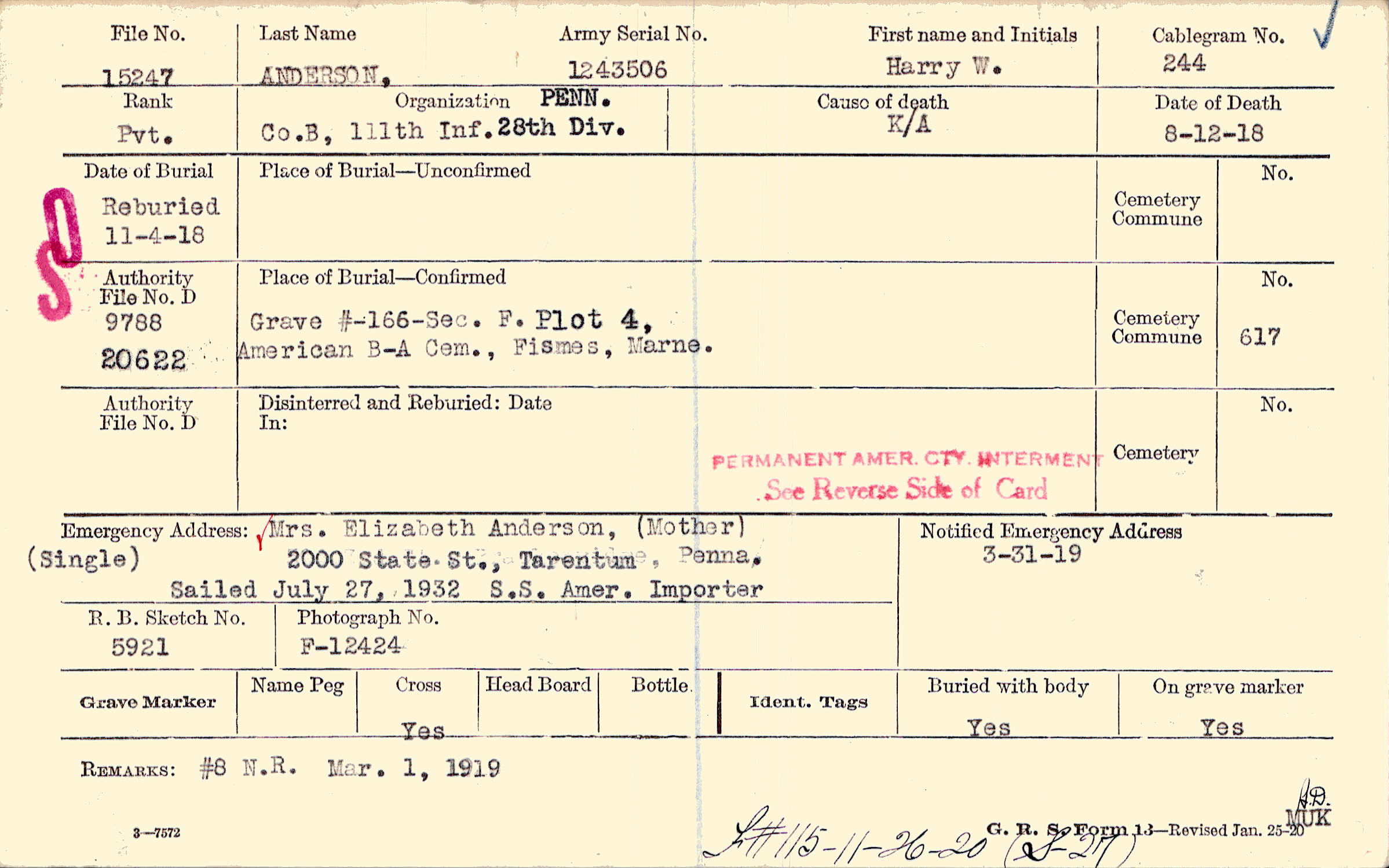 Grave #-166-Sec. F. Plot 4, American B-A Cem., Fismes, Marne.
