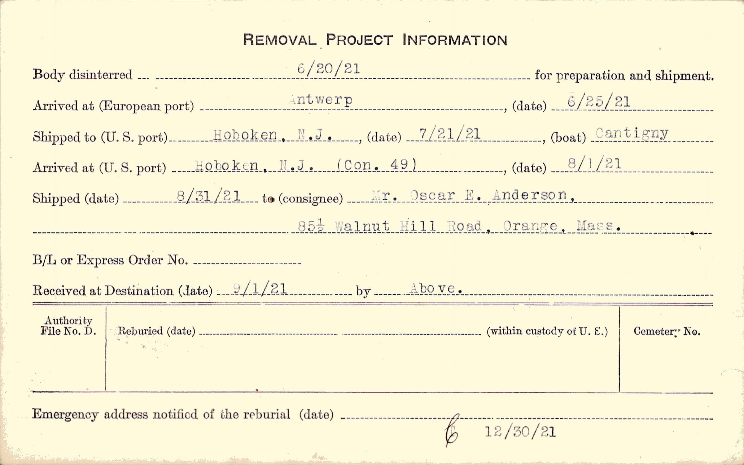 Oscar E. Anderson, (Father), 85 1/2 Walnut Hill, Orange, Mass.