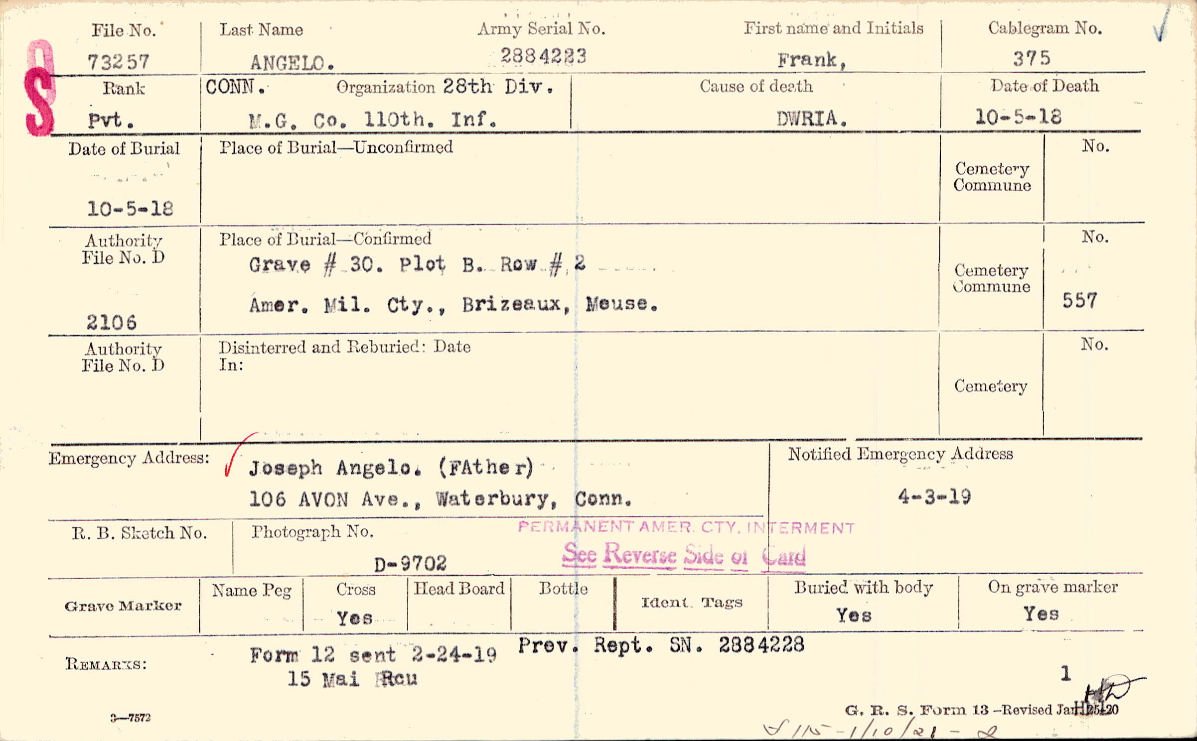 Joseph Angelo. (Father), 106 AVON Ave., Waterbury, Conn., PERMANENT AMER CTY. INTERMENT SEE REVERSE SIDE OF CARD