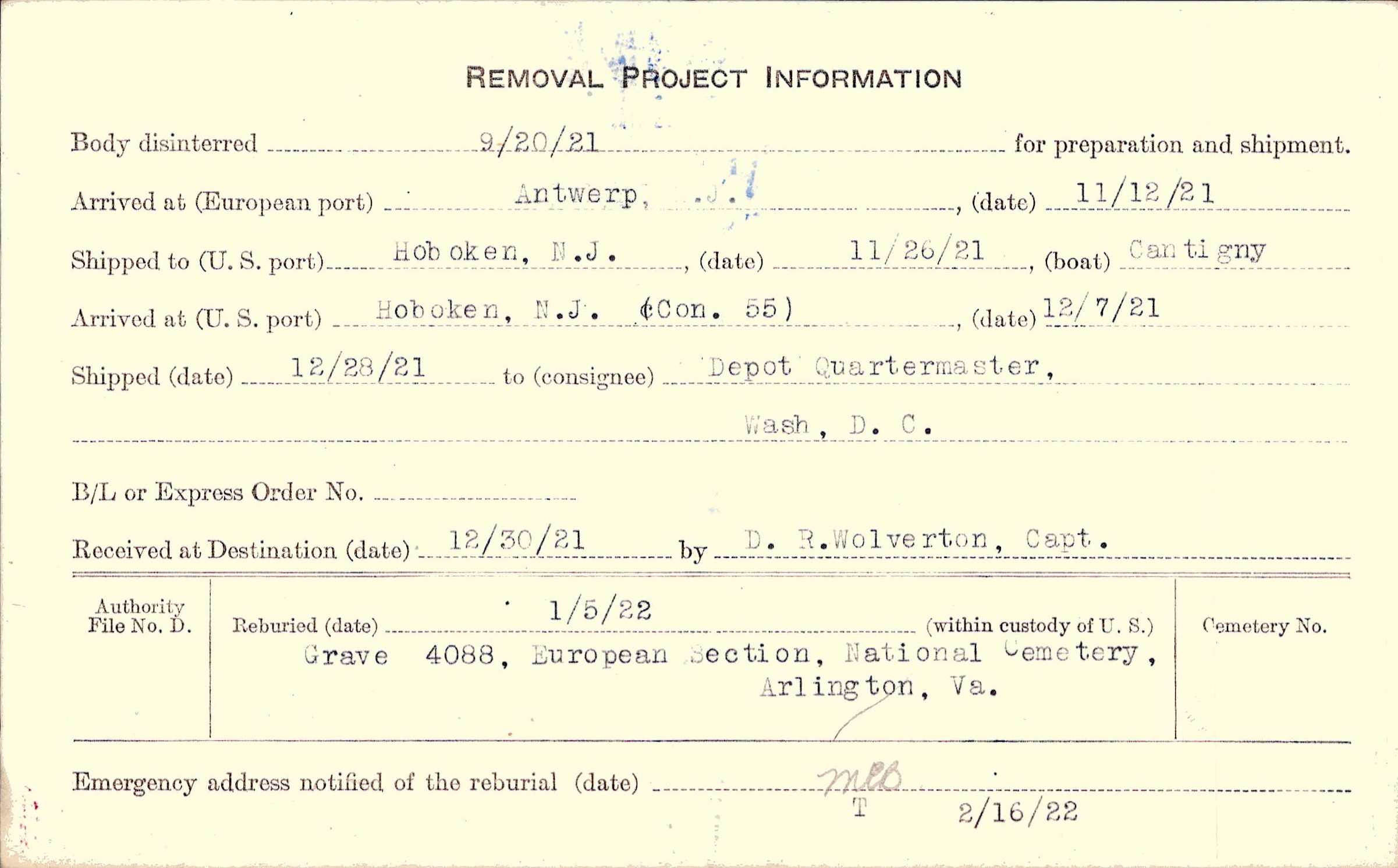 Body disinterred 9/20/1921 for preparation and shipment.