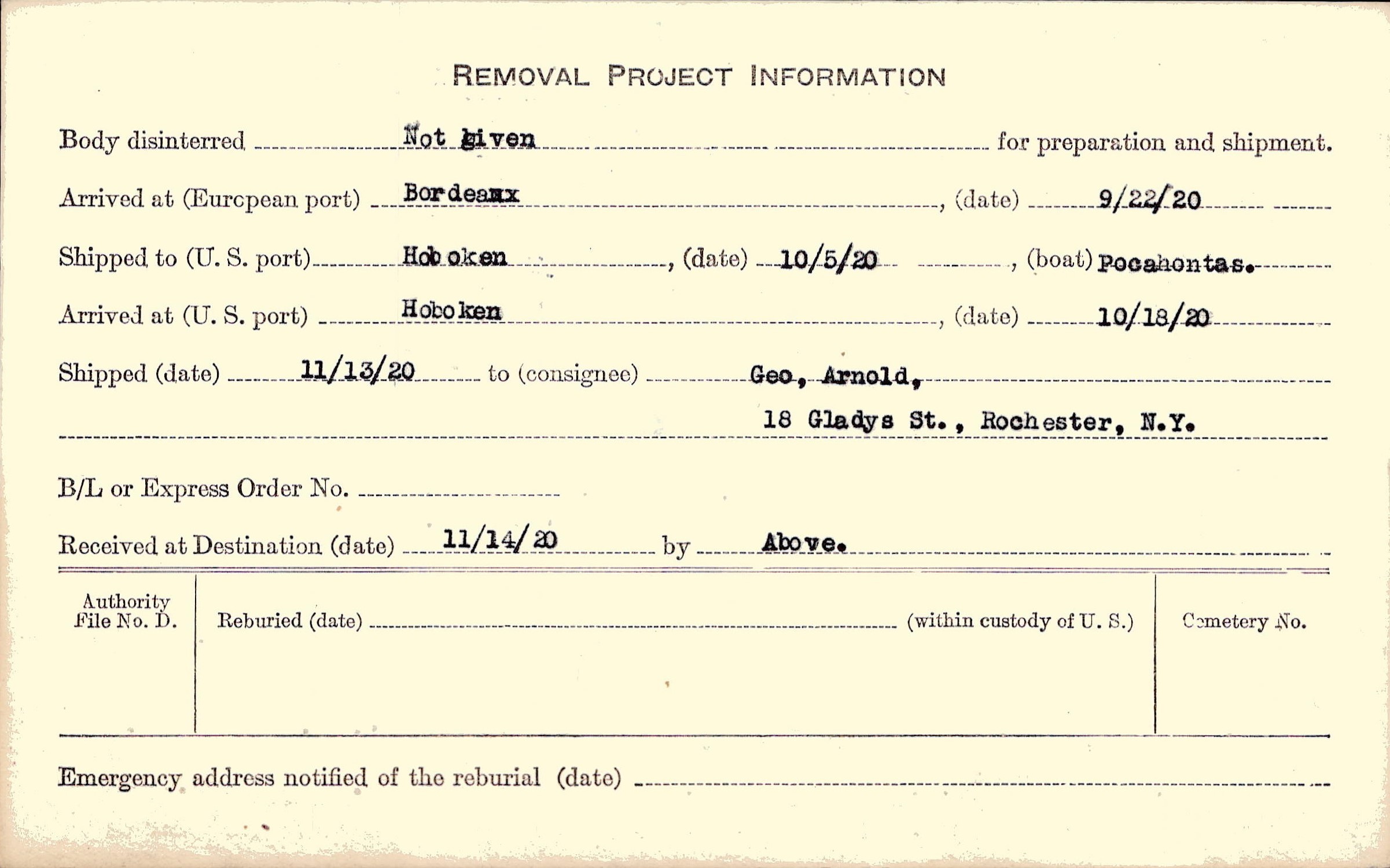to Geo, Arnold, 18 Gladys St., Rochester, N.Y.
