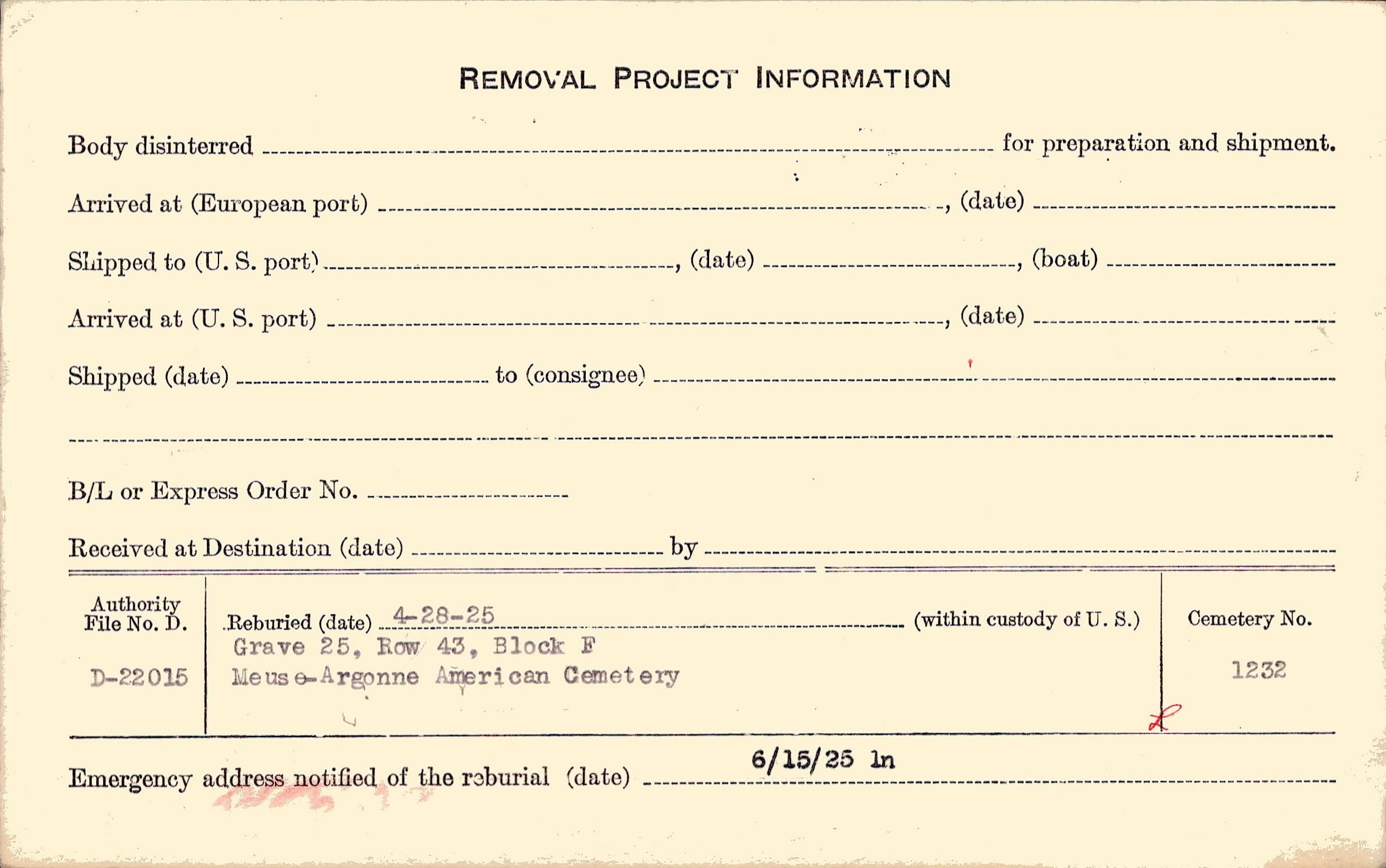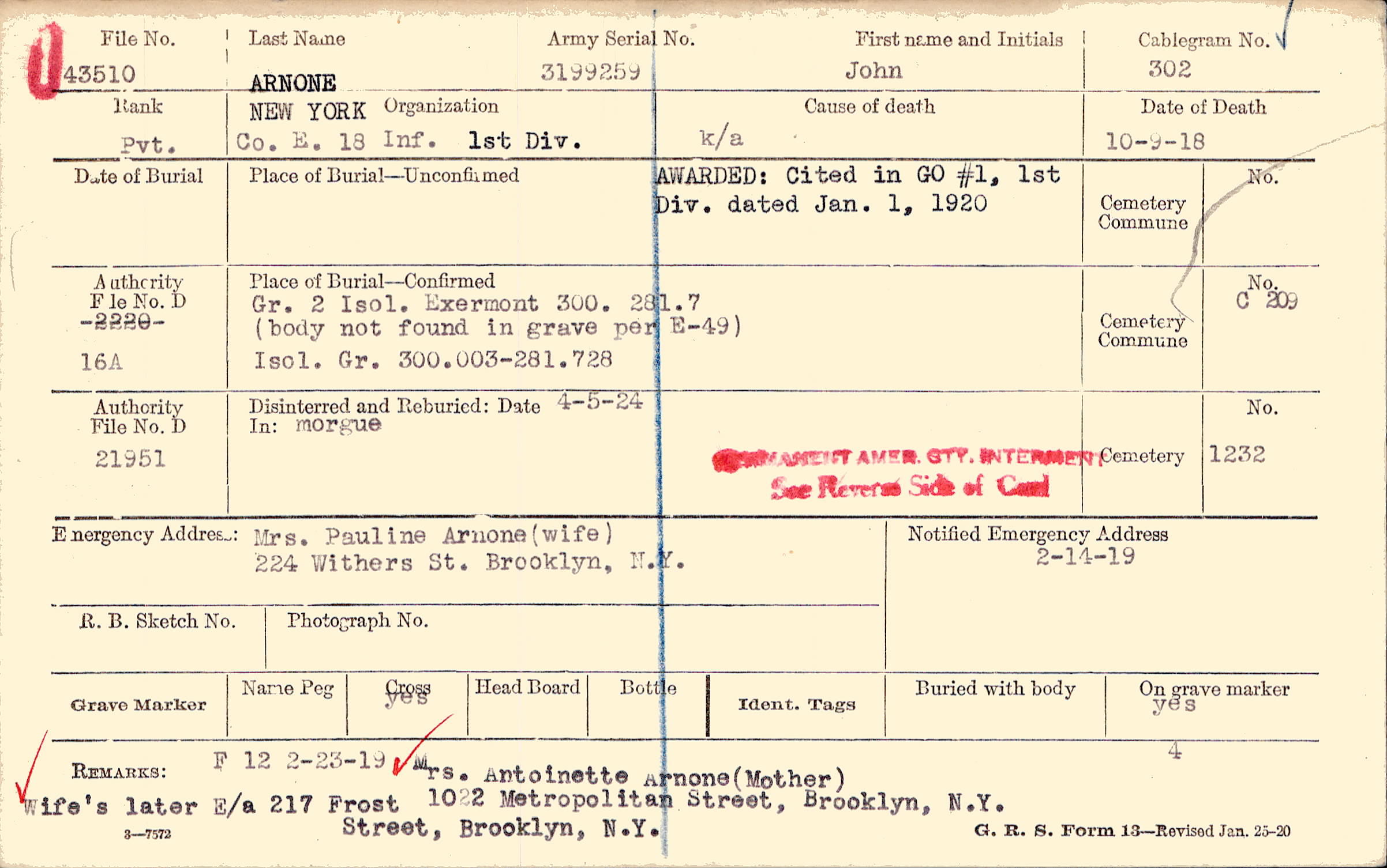 Mes. Antoinette Arnone (Mother) 1022 Metropolitan Street, Brookly, N.Y. Wife's later E/a 217 Frost Street, Brooklyn, N.Y., F 12 2-23-19