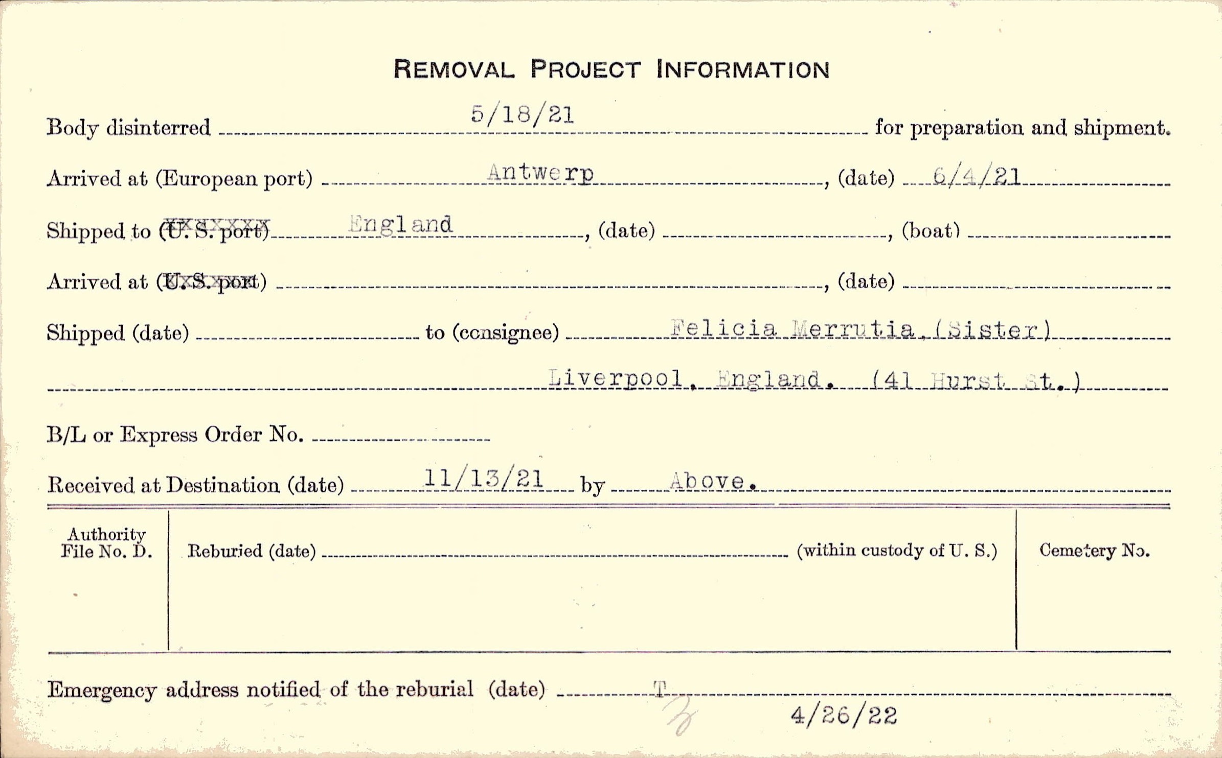 to Felicia Merrutia, (Sister), Liverpool, England, (41 Hurst St.)
