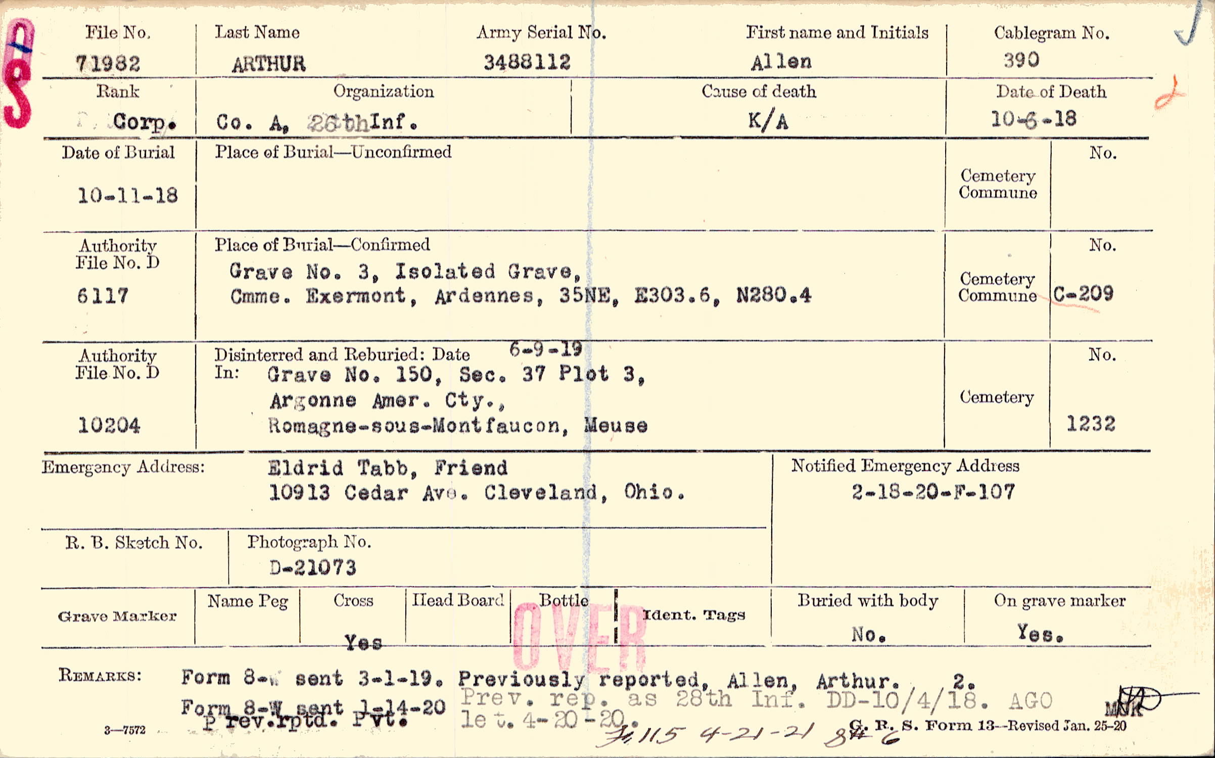 Previously reported, Allen, Arthur. Prev. rep. as 28th Inf. DD-10/4/18. AGO let. 4-20-20. Prev. rptd. Pvt.