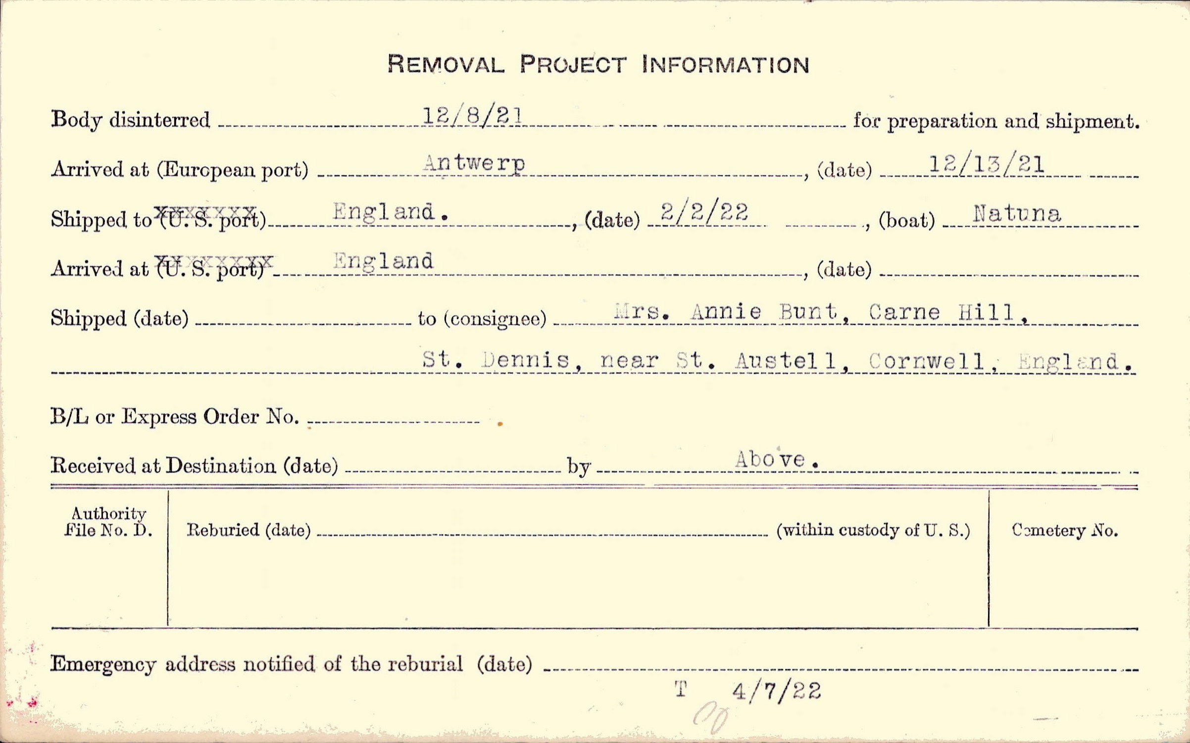 Body disinterred 12/8/1921 for preparation and shipment.