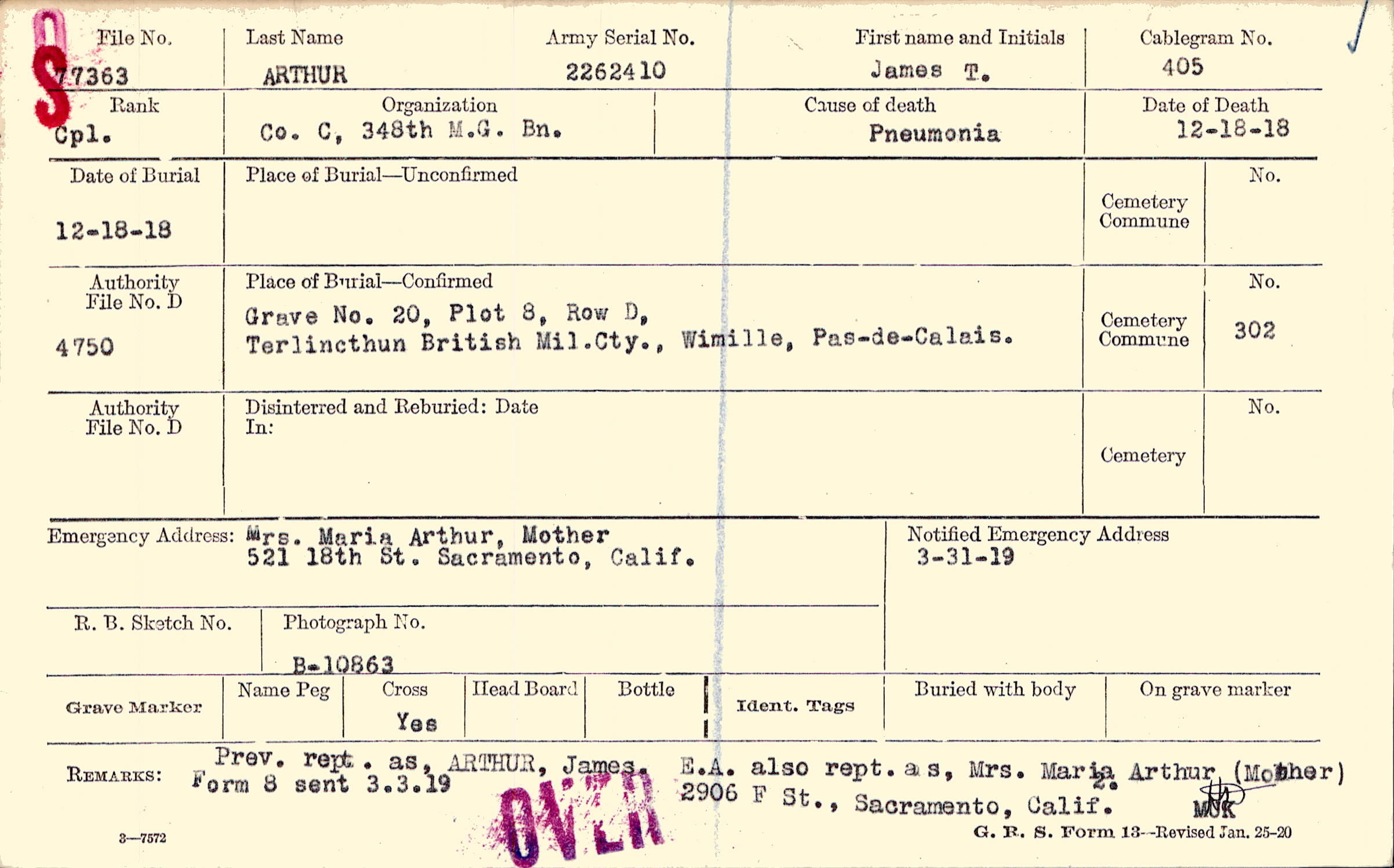 Prev. rept. as, ARTHUR, James. E.A. alos rept. as, Mrs. Maria Arthur (Mother) 2906 F. St., Sacramento, Calif., Form 8 sent 3.3.19