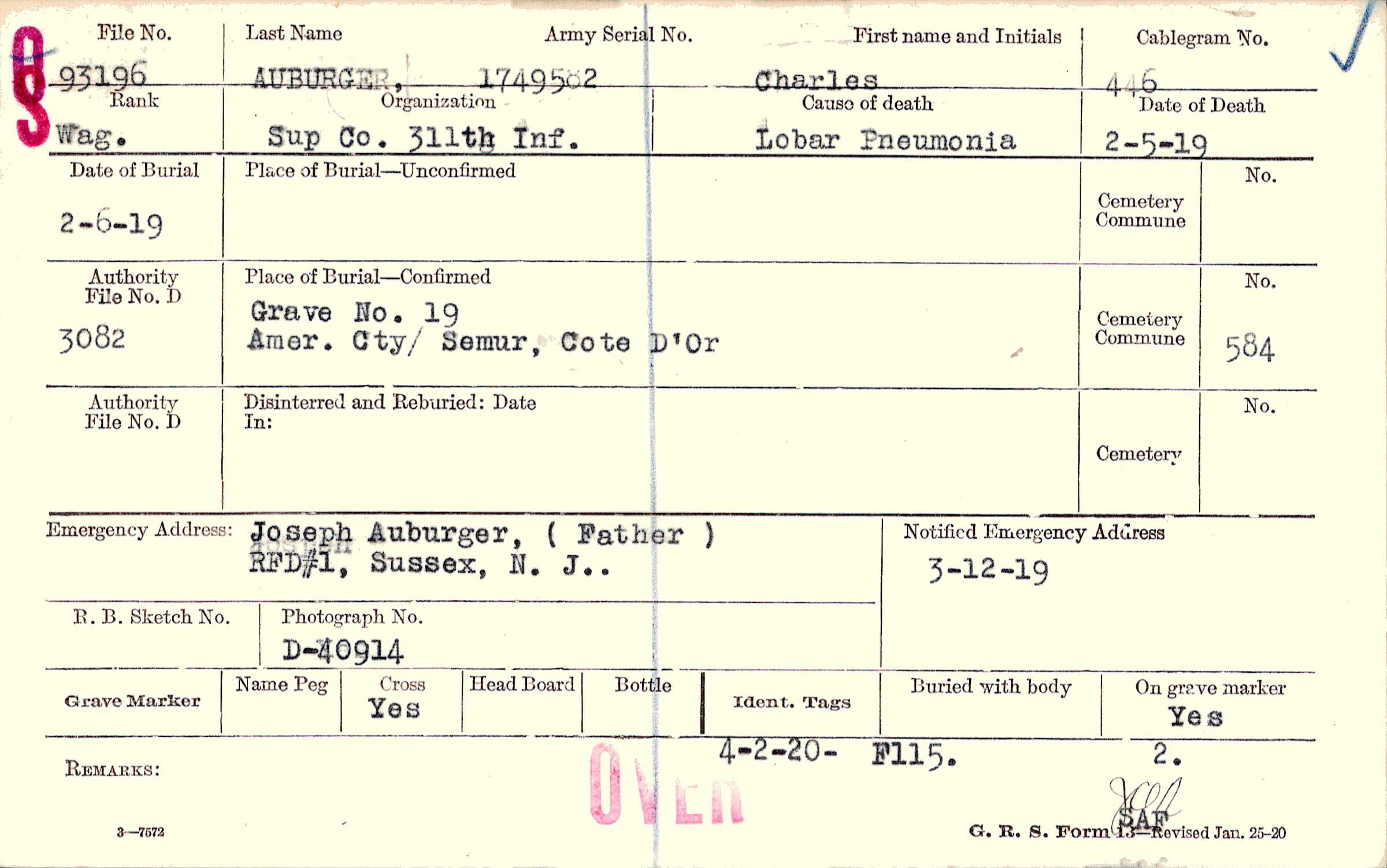 Joseph Auburger, (Father), RFD #1, Sussex, N.J..