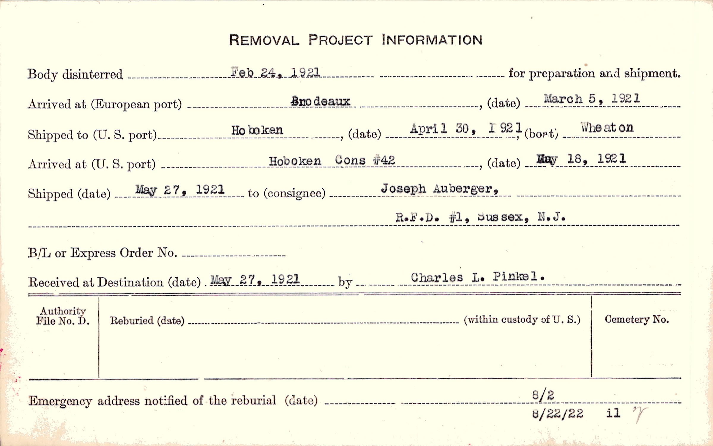 Body disinterred 2/24/1921 for preparation and shipment.