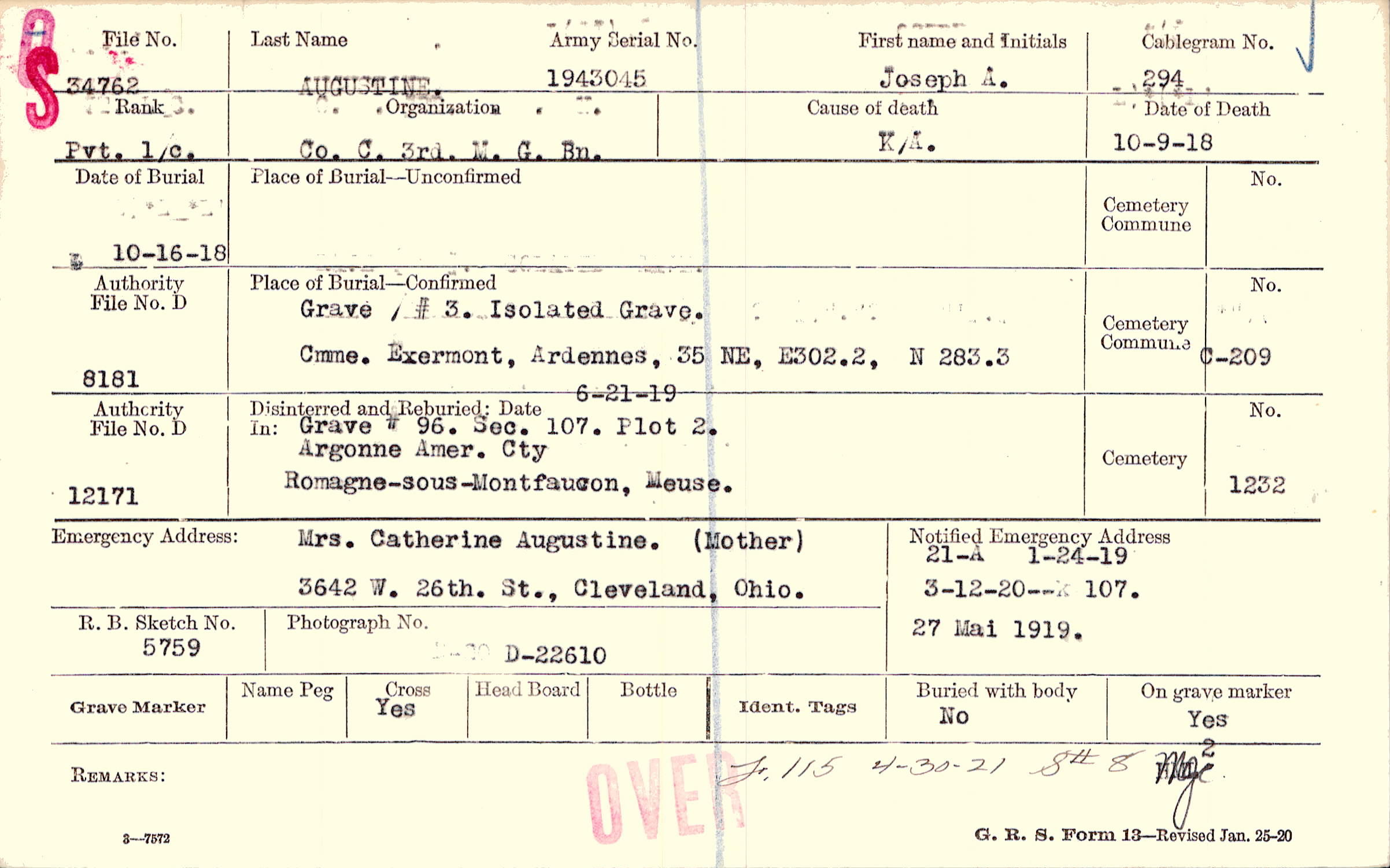 Mrs. Catherine Augustine. (Mother), 3642 W. 26th. St., Cleveland, Ohio.