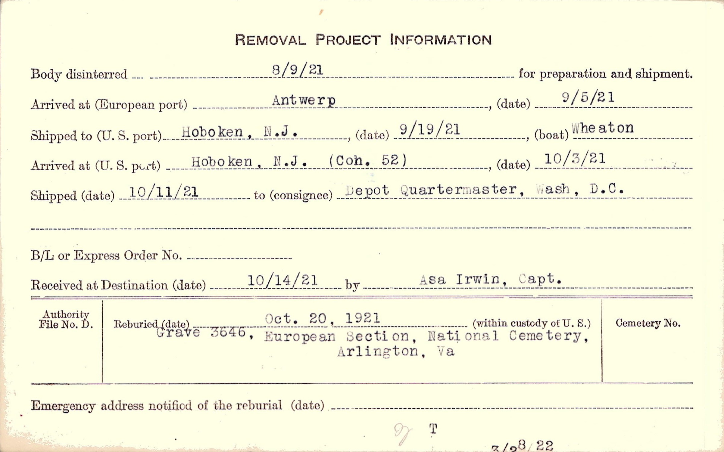 Body disinterred 8/9/1921 for preparation and shipment.
