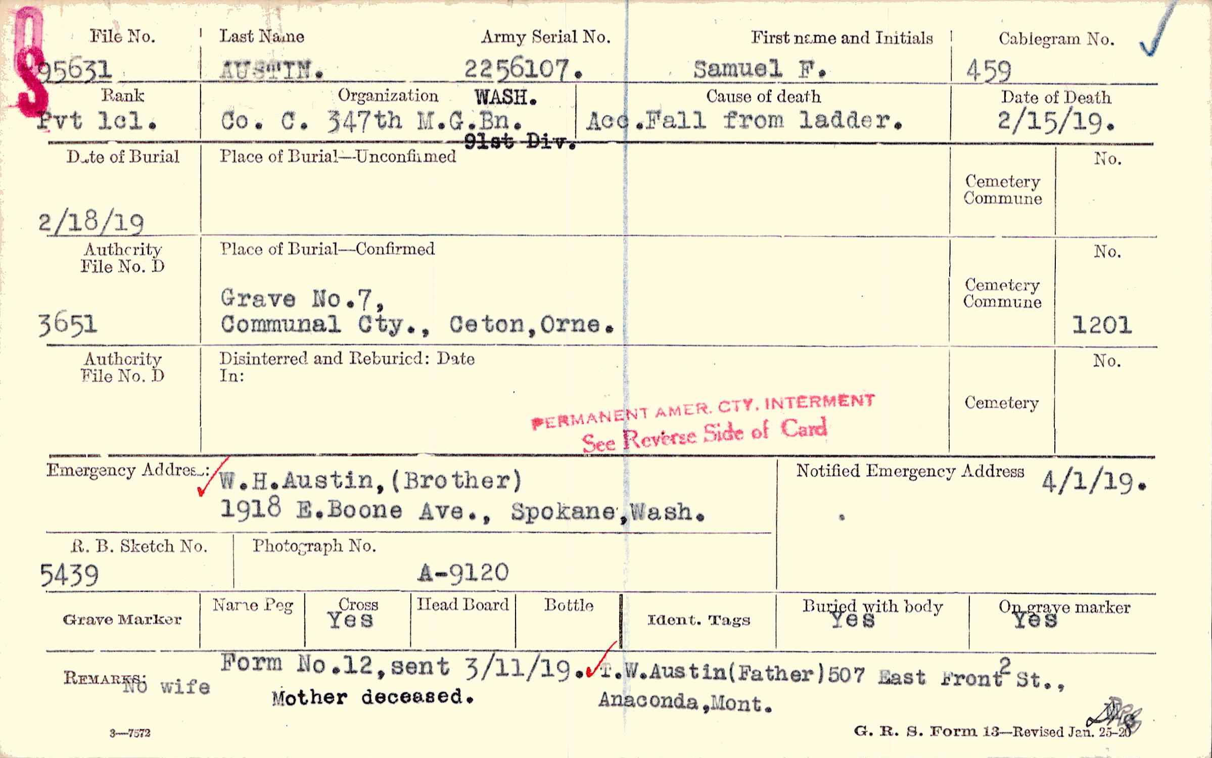 No wife Mother deceased T.W. Austin (Father) 507 East Front St., Anaconda, Mont., Form No. 12 sent 3/11/19.