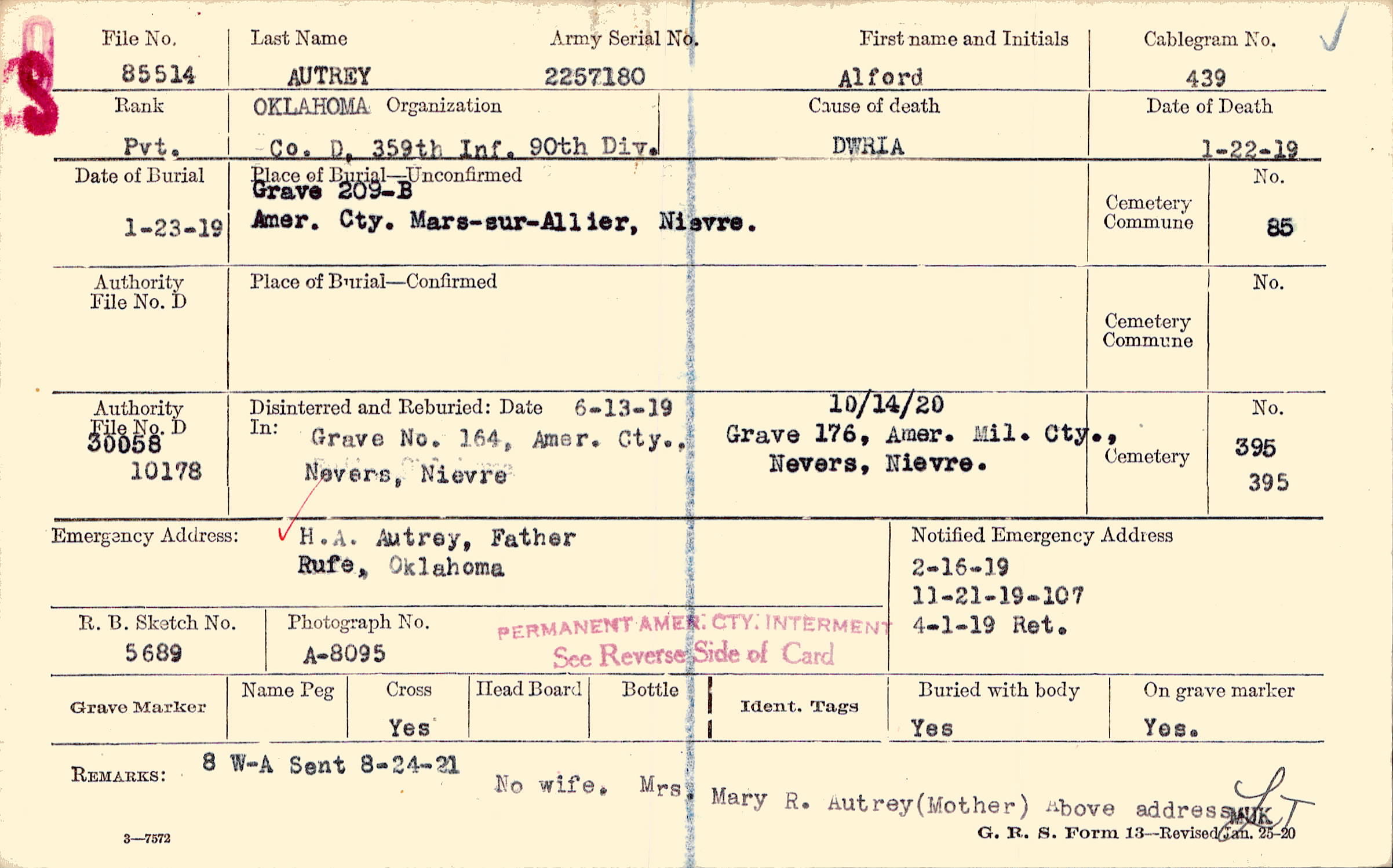 No wife. Mrs. Mary R. Autrey (Mother) Above address, 8 W-A Sent 8-24-21
