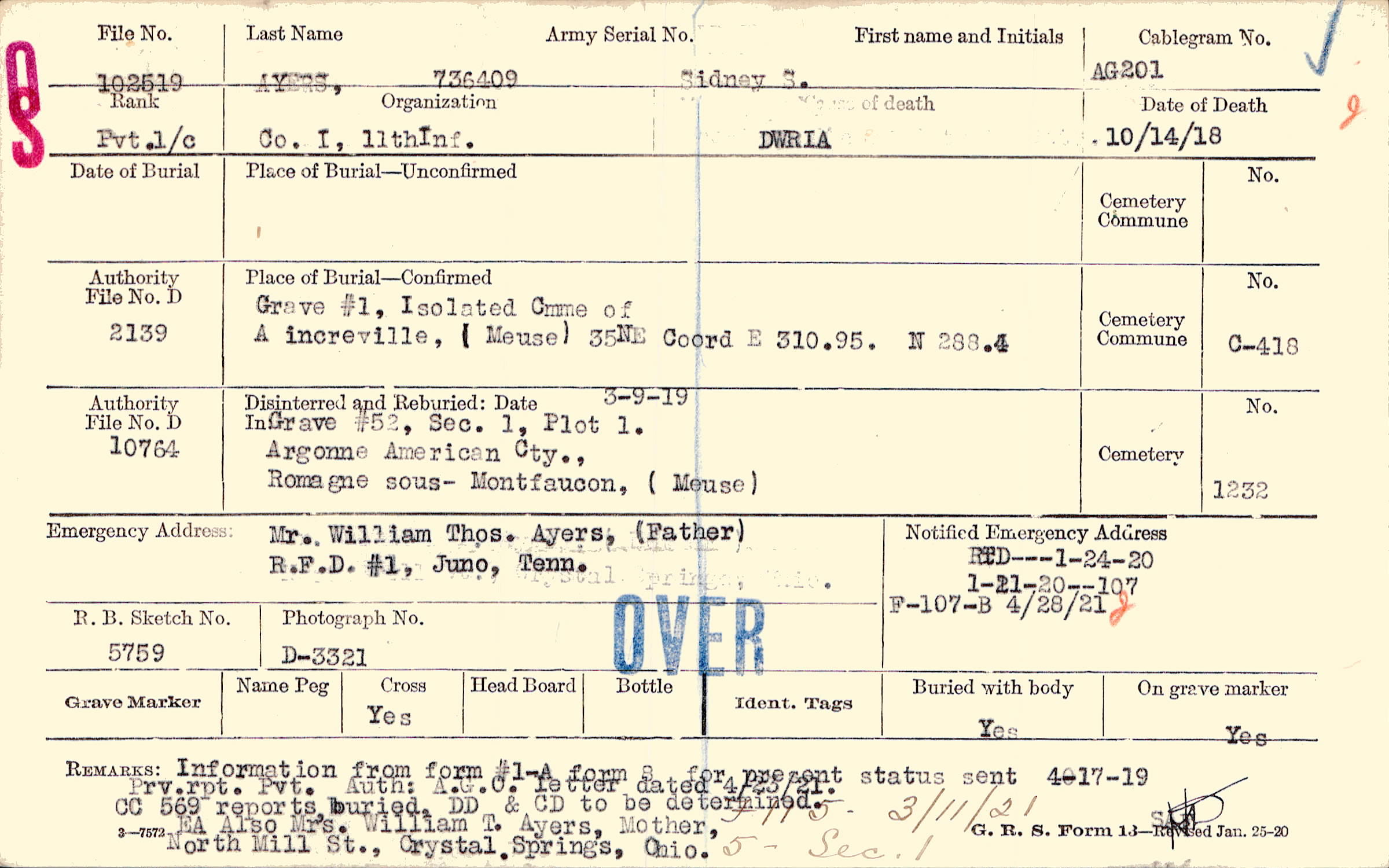 Mr. William Thos. Ayers, (Father), R.F.D. #1, Juno, Tenn.
