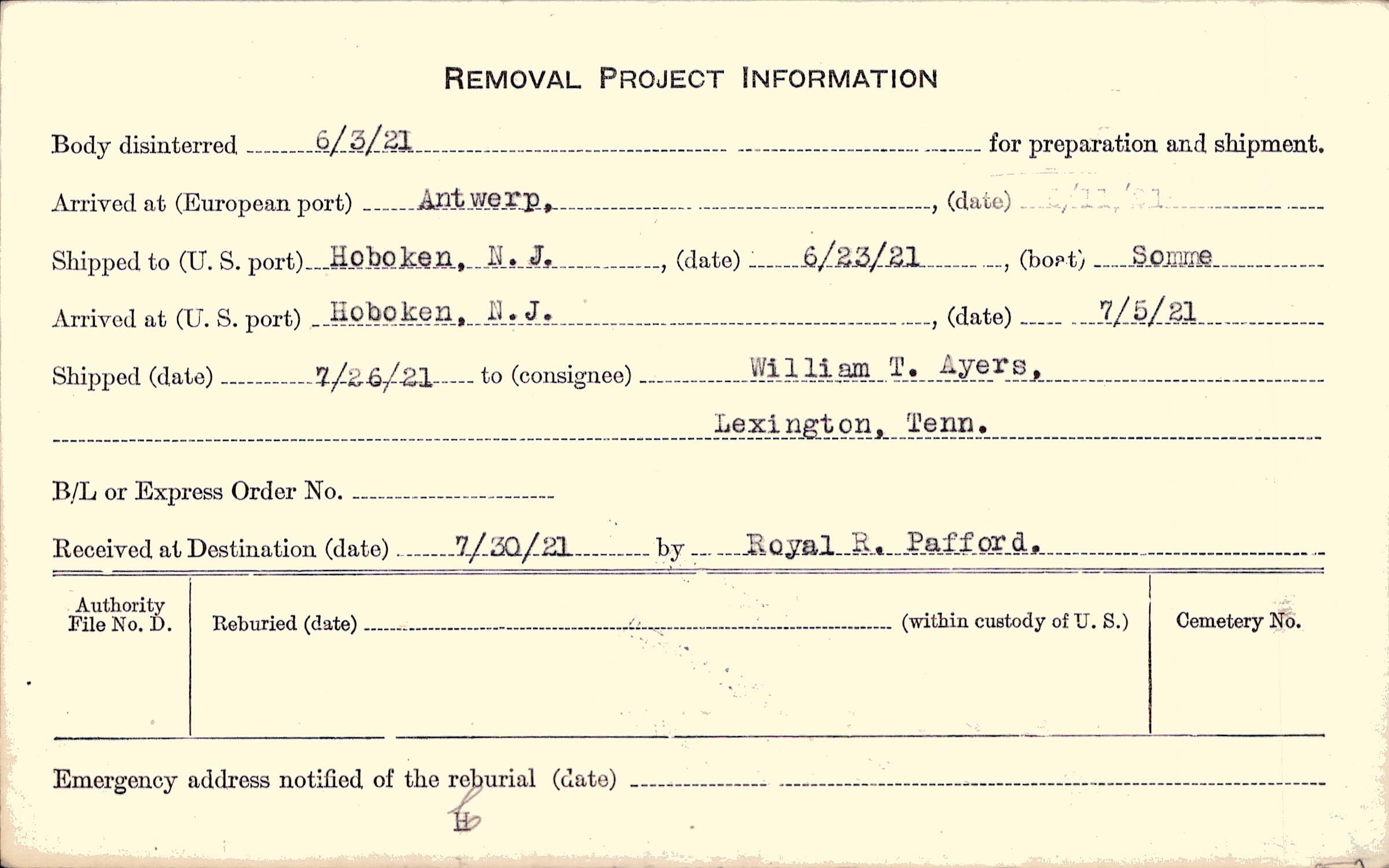 Body disinterred 6/3/1921 for preparation and shipment.