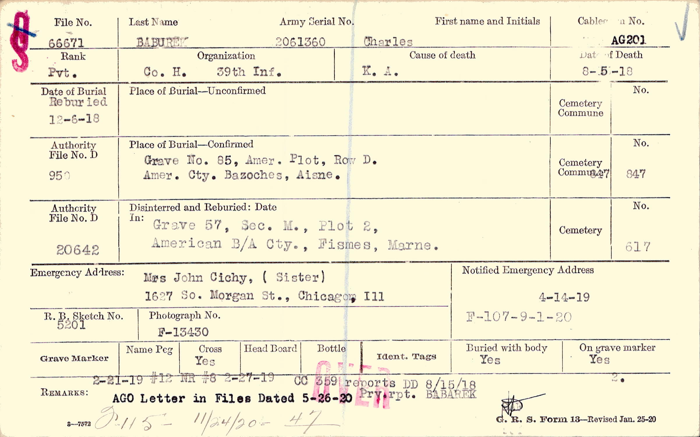 Mrs John Cichy, (Sister), 1627 So. Morgan St., Chicago, Ill