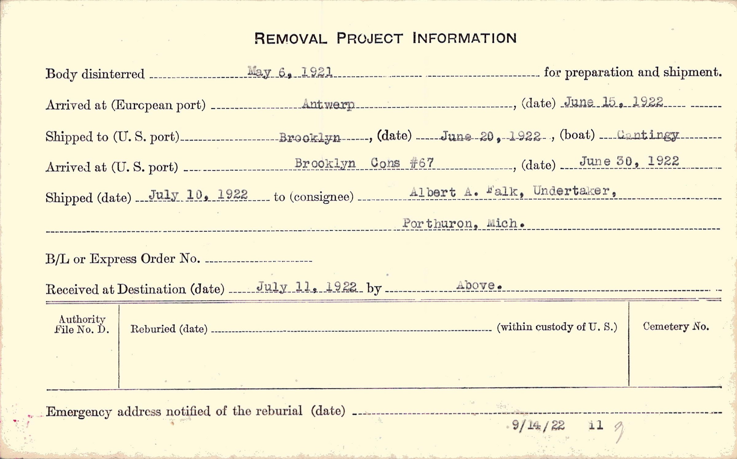 to Albert A. Falk, Undertaker, Porthuron, Mich.