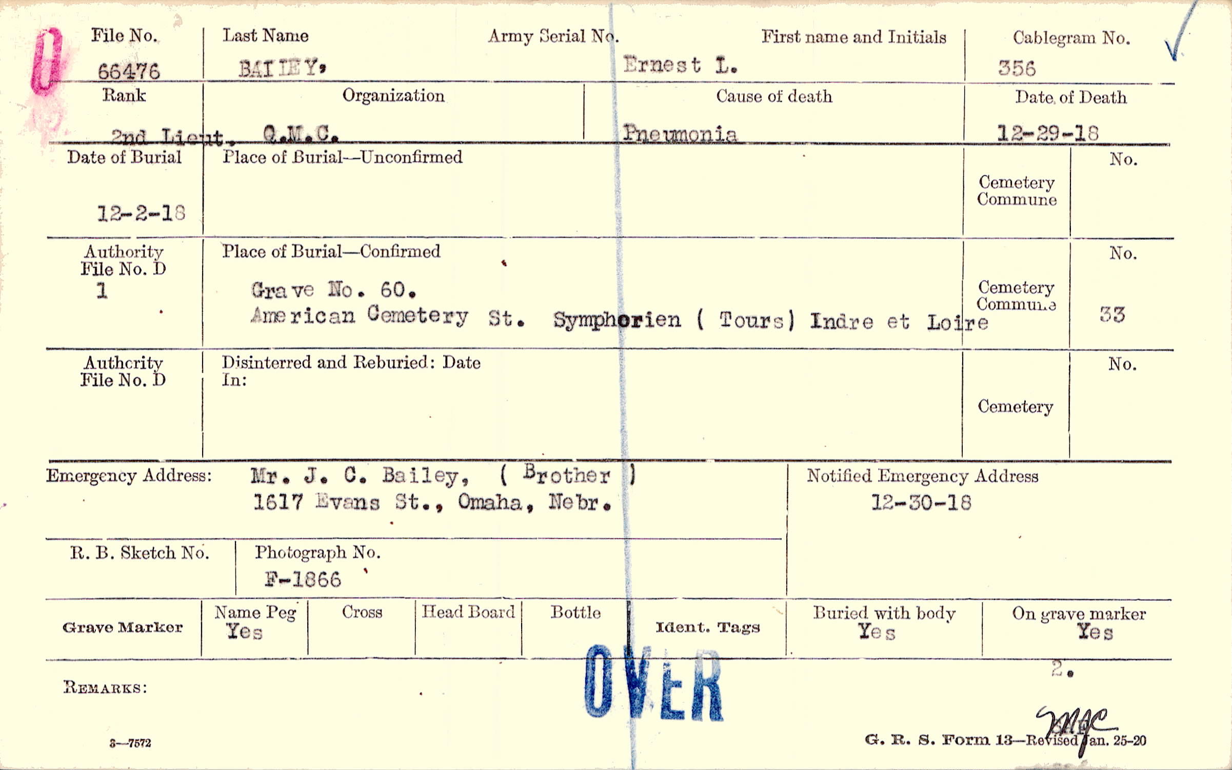 Grave 60, American Cemetery, St. Symphorien, Tours, Indre et Loire
