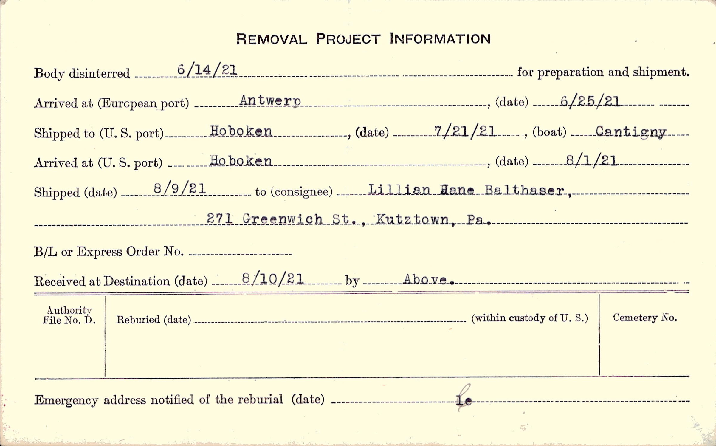 Body disinterred 6/14/1921 for preparation and shipment.