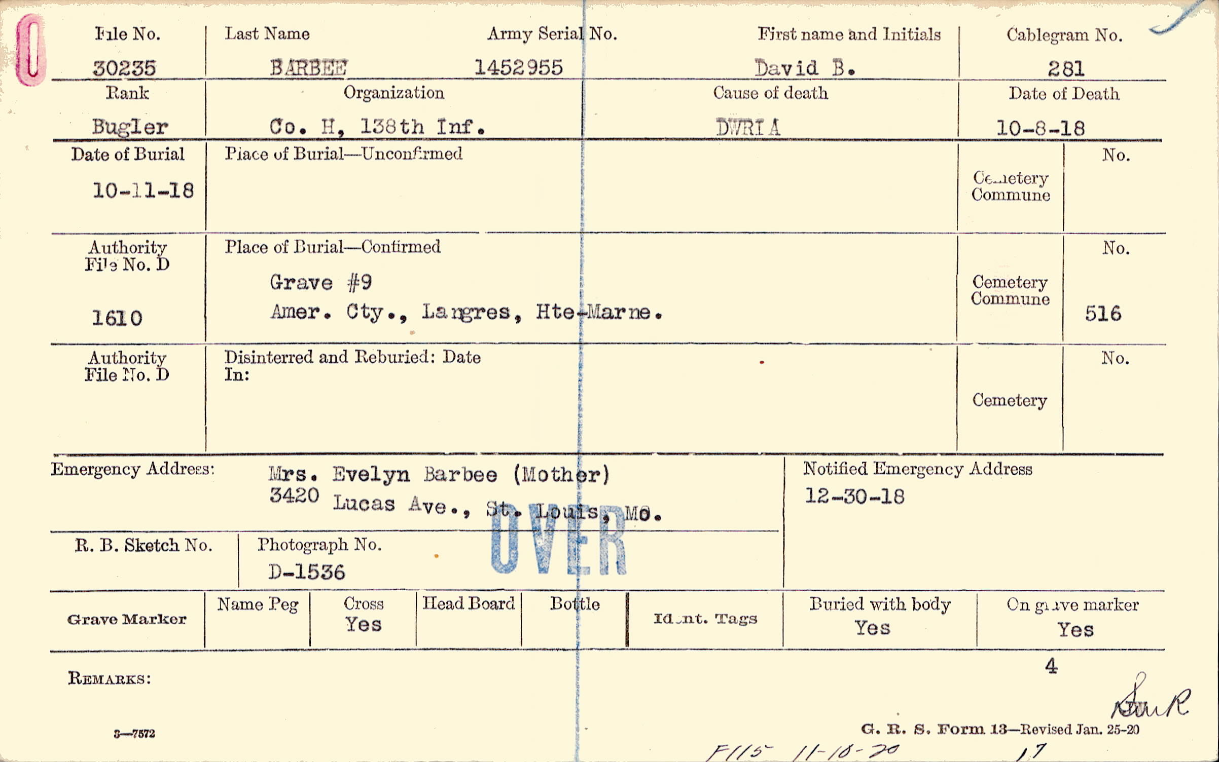 Mrs. Evelyn Barbee (Mother), 3420 Lucas Ave., St. Louis, Mo.