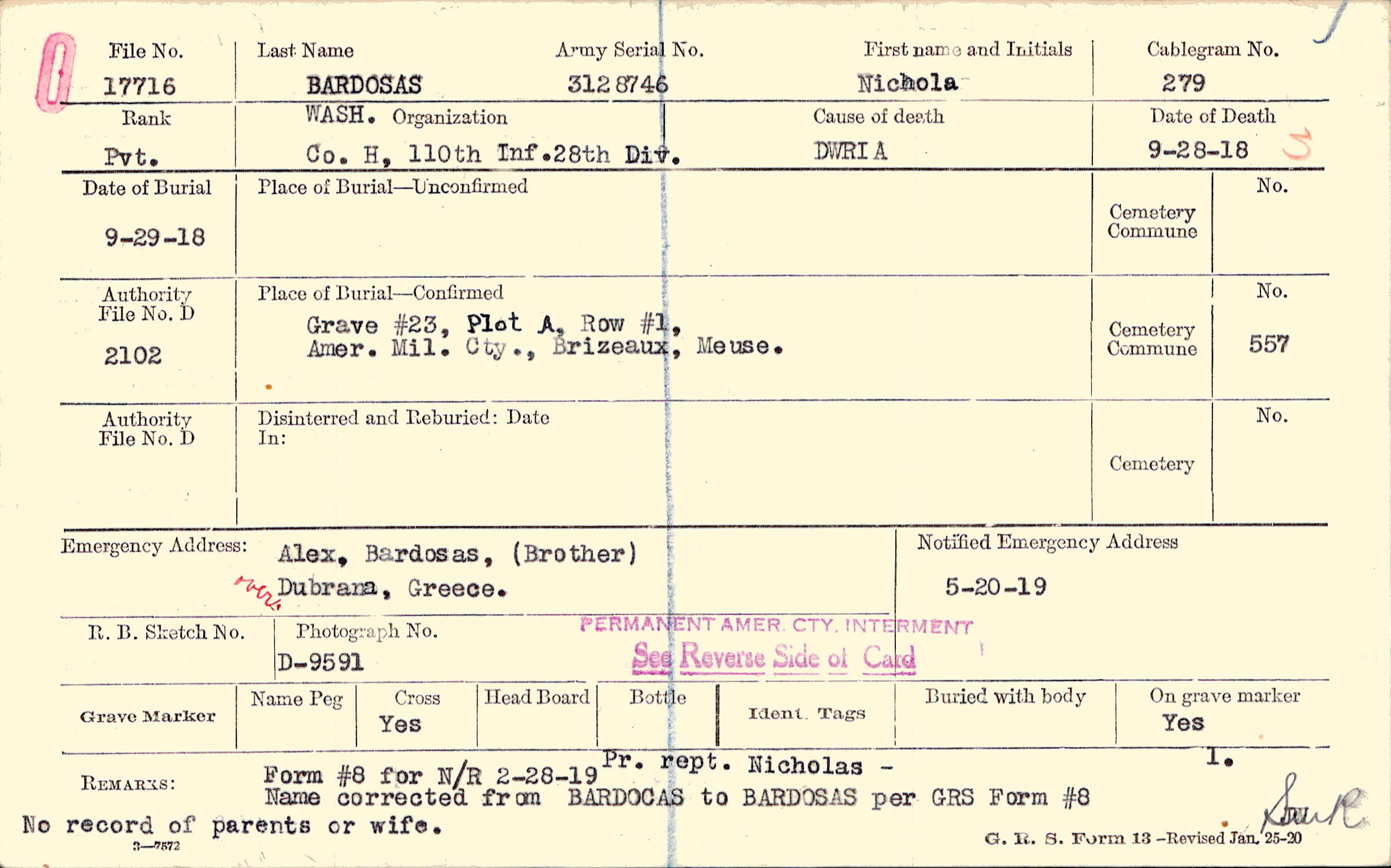 Pr. rept. Nicholas - Name corrected from BARDOCAS to BARDOSAS per GRS Form#8 No record of parents or wife., Form #8 for N/R 2-28-19 Name corrected from BARDOCAS to BARDOSAS per GRS Form #8
