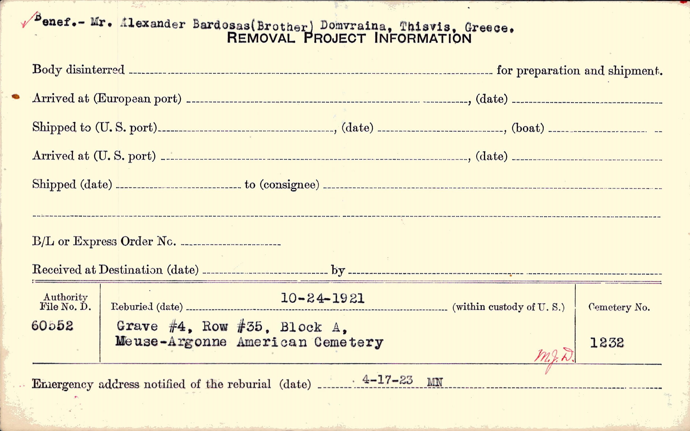 Benef. - Mr. Alexander Bardosas (Brother) Domvraina, Thisvis, Greece. |
