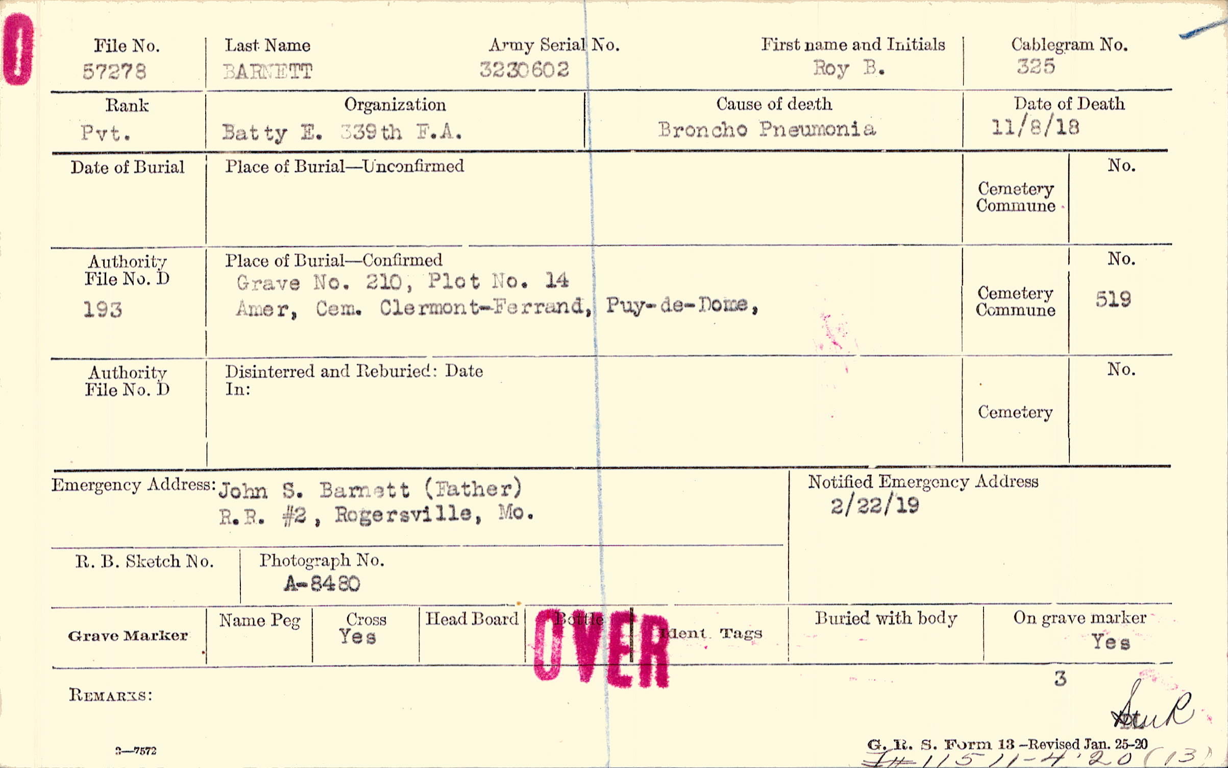 Grave 210, Plot 14, Amer. Cem., Clermont-Ferrand, Puy-de-Dome