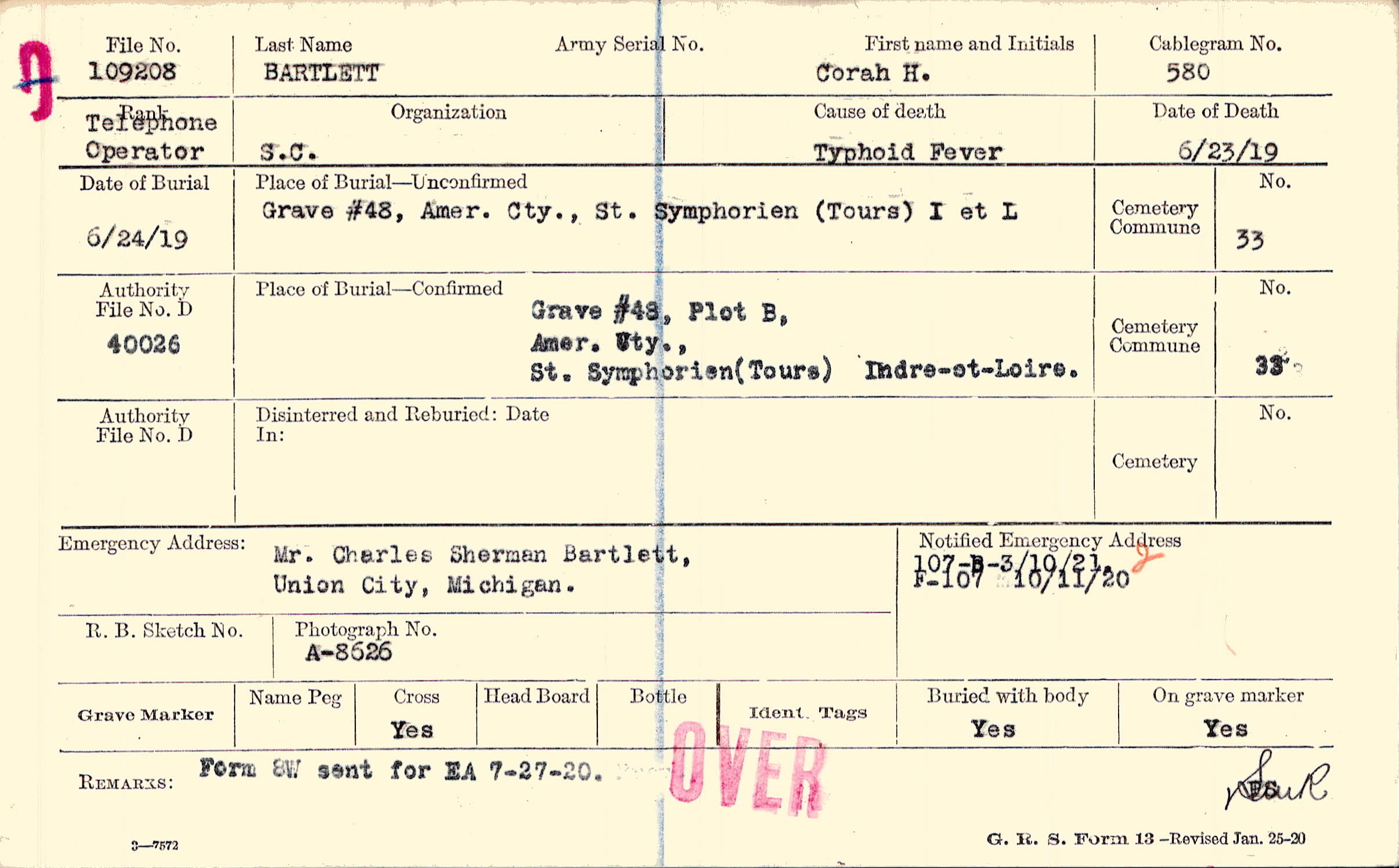 Grave #48, Plot B, Amer. Cty., St. Symphorien, Tours, Indre-et-Loire