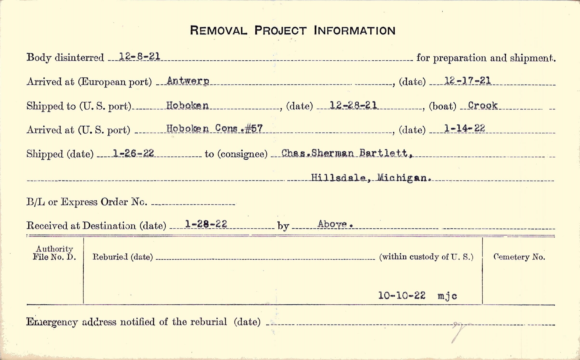 Body disinterred 12/8/1921 for preparation and shipment.