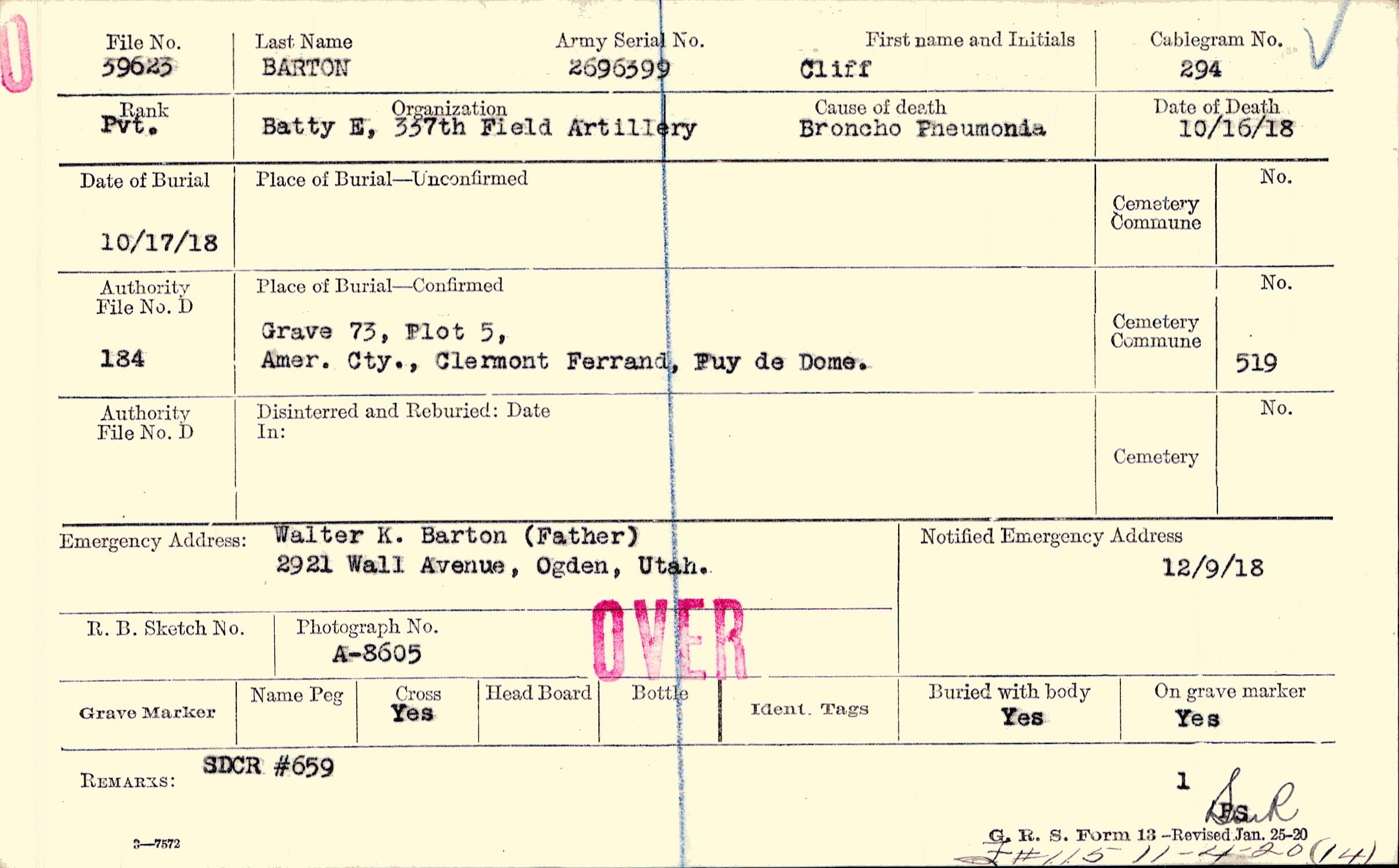 Grave 73, Plot 5,Amer. Cty., Clermont Ferrand, Fuy de Dome
