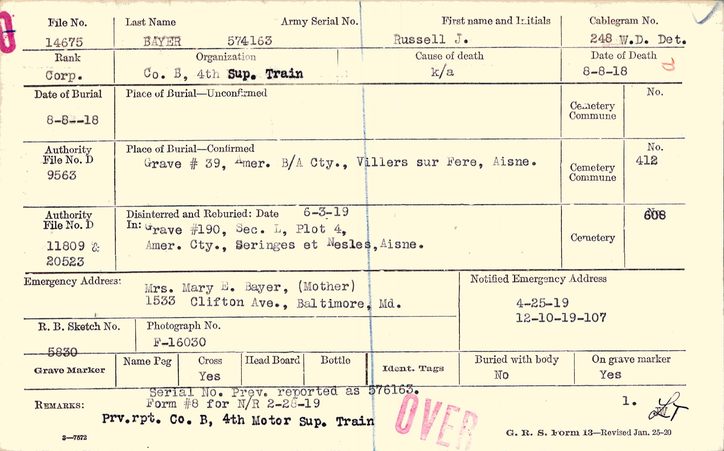 Serial No. Prev. reported as 576163., Form #8 for N/R 2-28-19, Prv. rpt. Co. B, 4th Motor Sup. Train