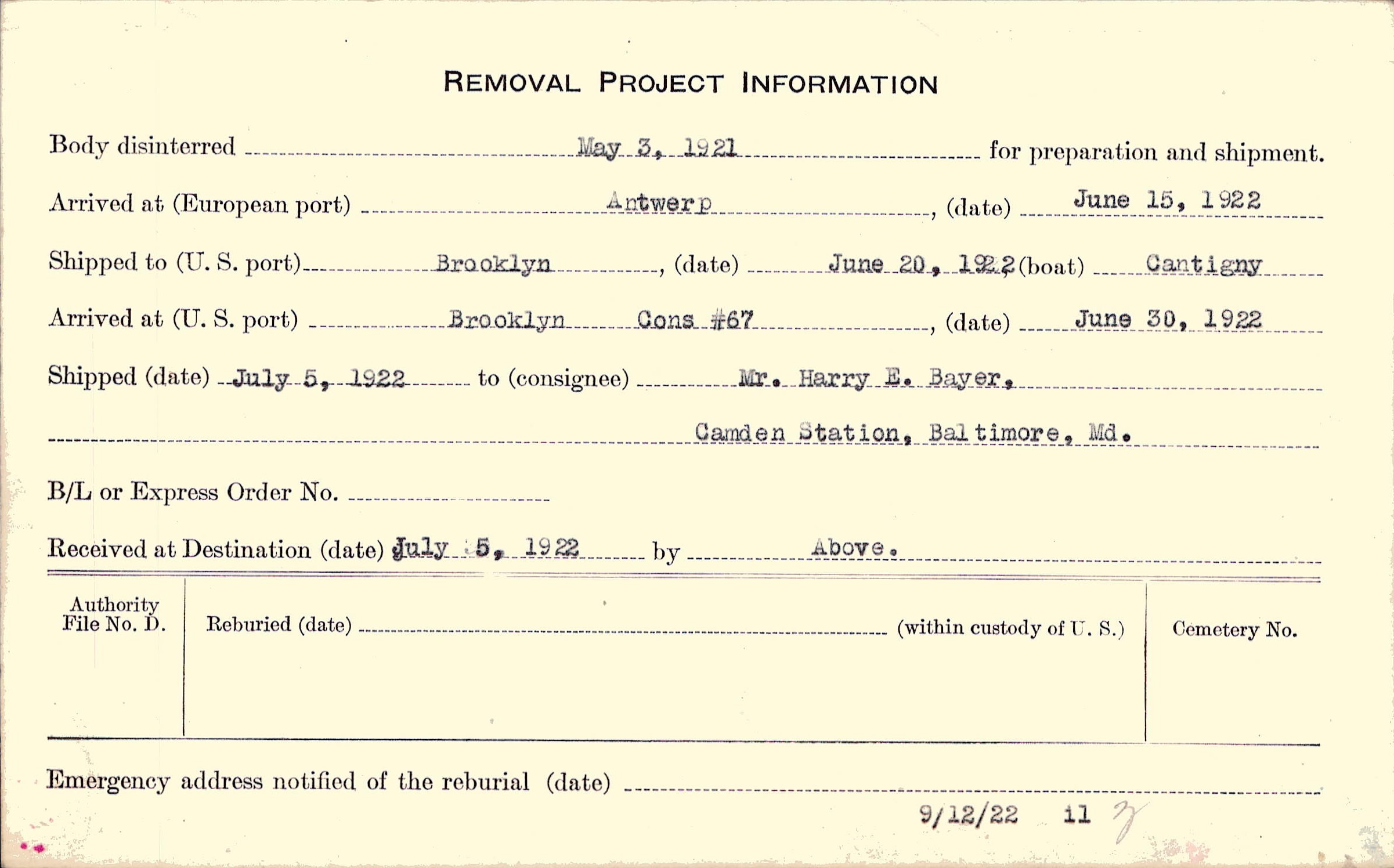 Body disinterred 5/3/1921 for preparation and shipment.