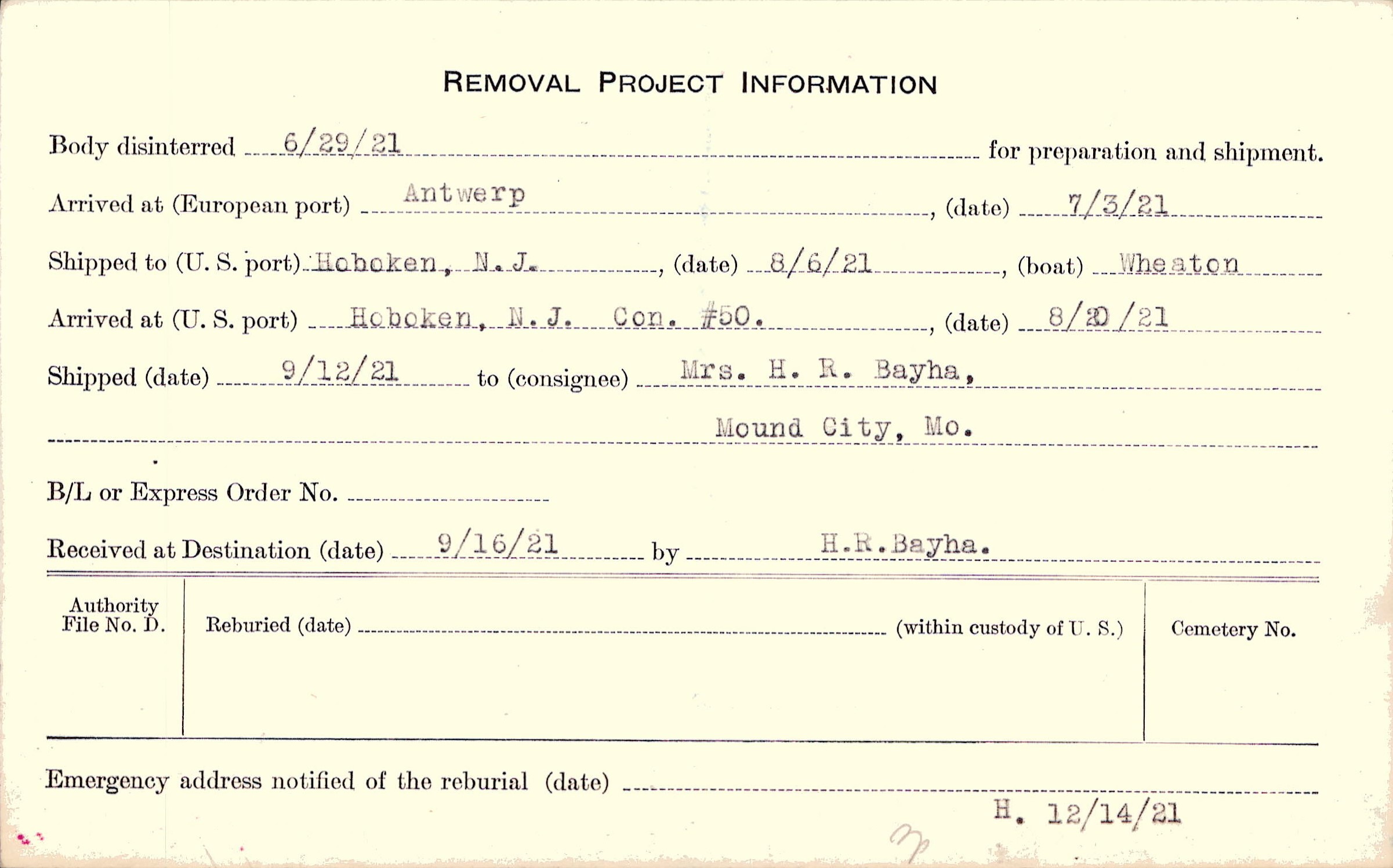 Body disinterred 6/29/1921 for preparation and shipment.