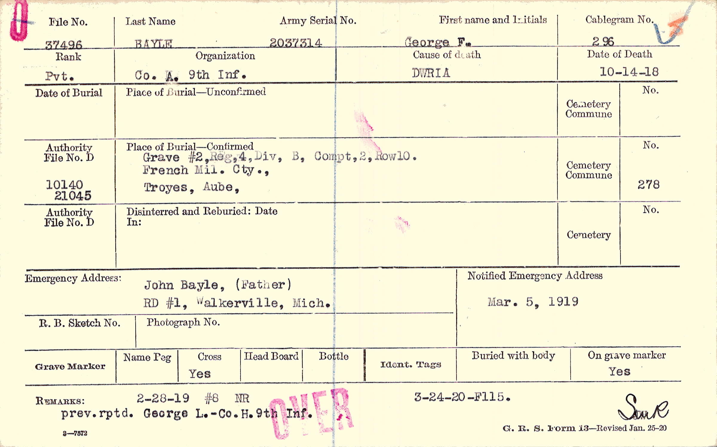 prev. rptd. George L. -Co. H. 9th Inf., 2-28-19 #8 NR, 3-24-20-F115.