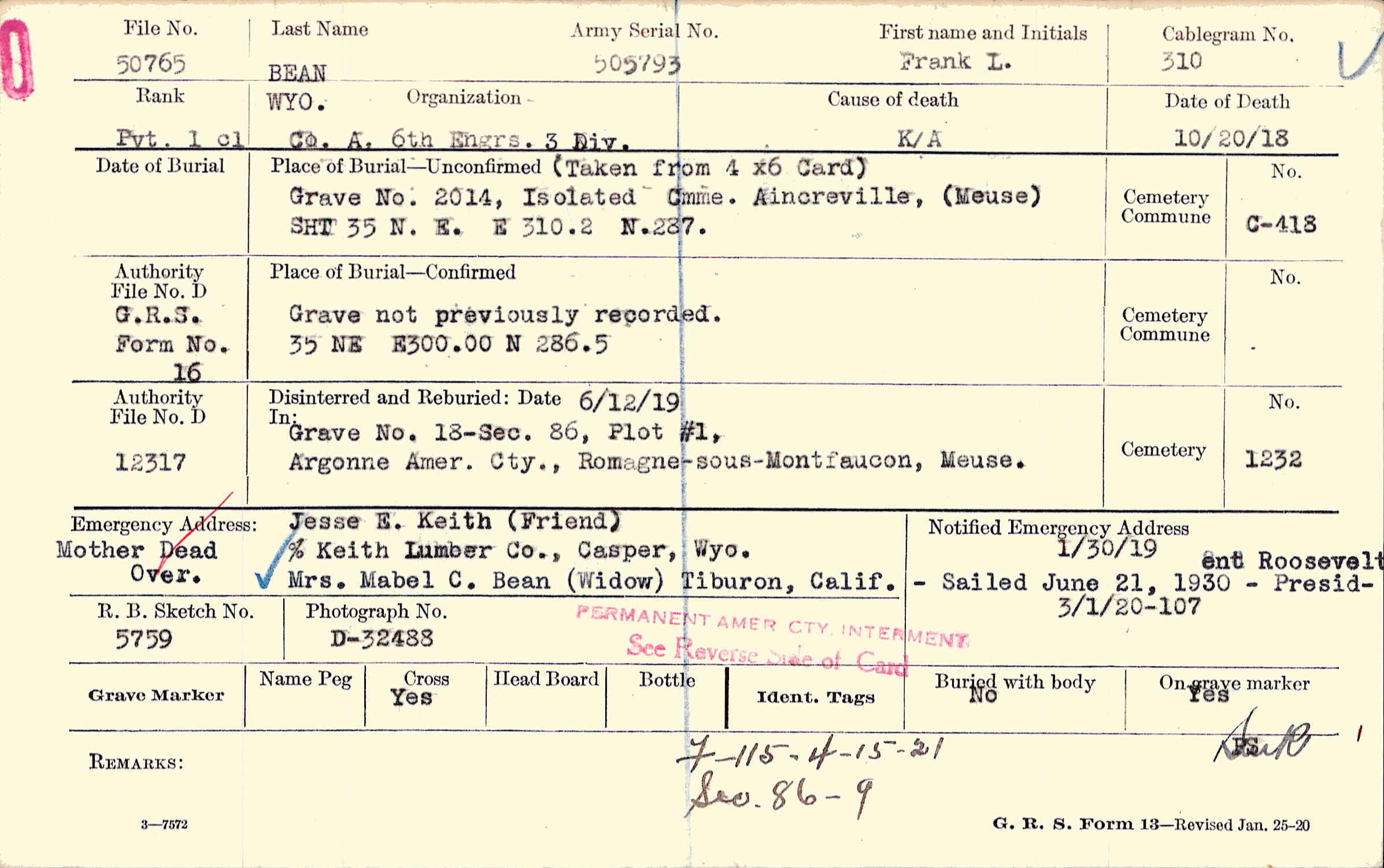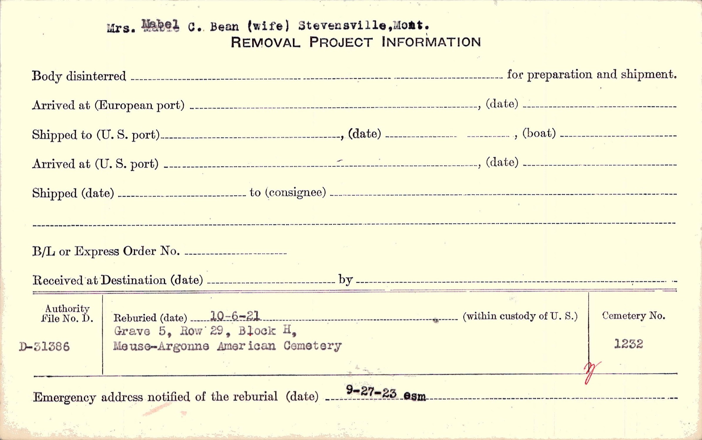 Mrs. Mabel C. Bean (wife) Stevensville, Mont. |