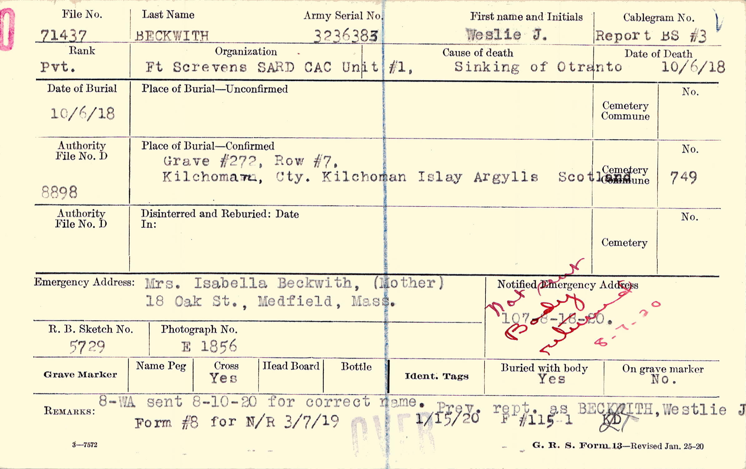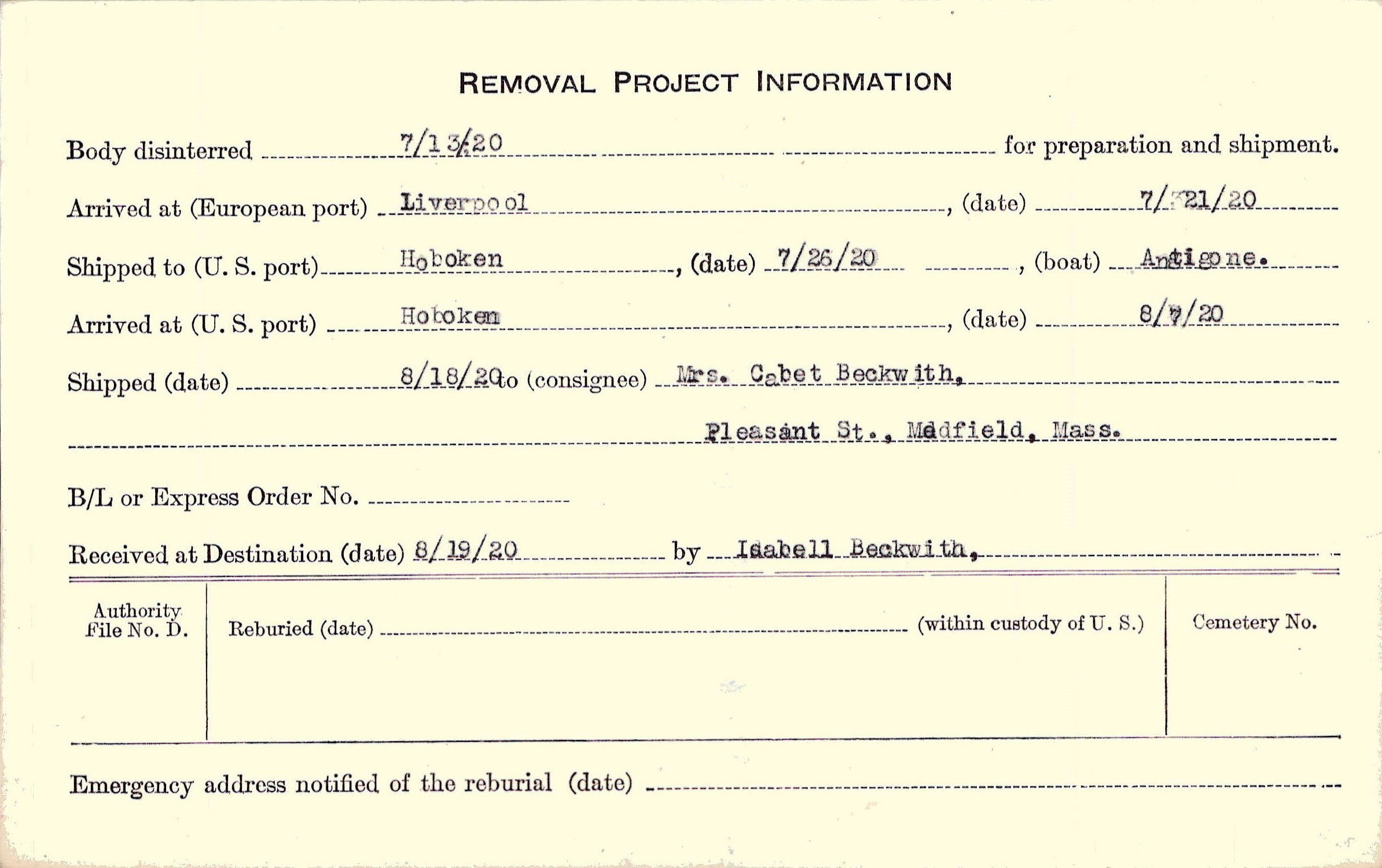 Mrs. Isabella Beckwith, (Mother), 18 Oak St., Medfield, Mass.