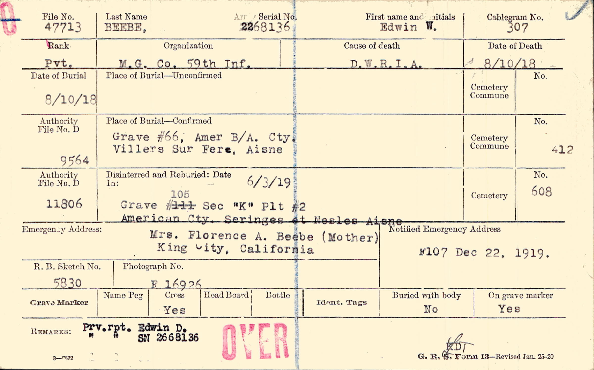 Mrs. Florence A. Beebe (Mother), King City, California