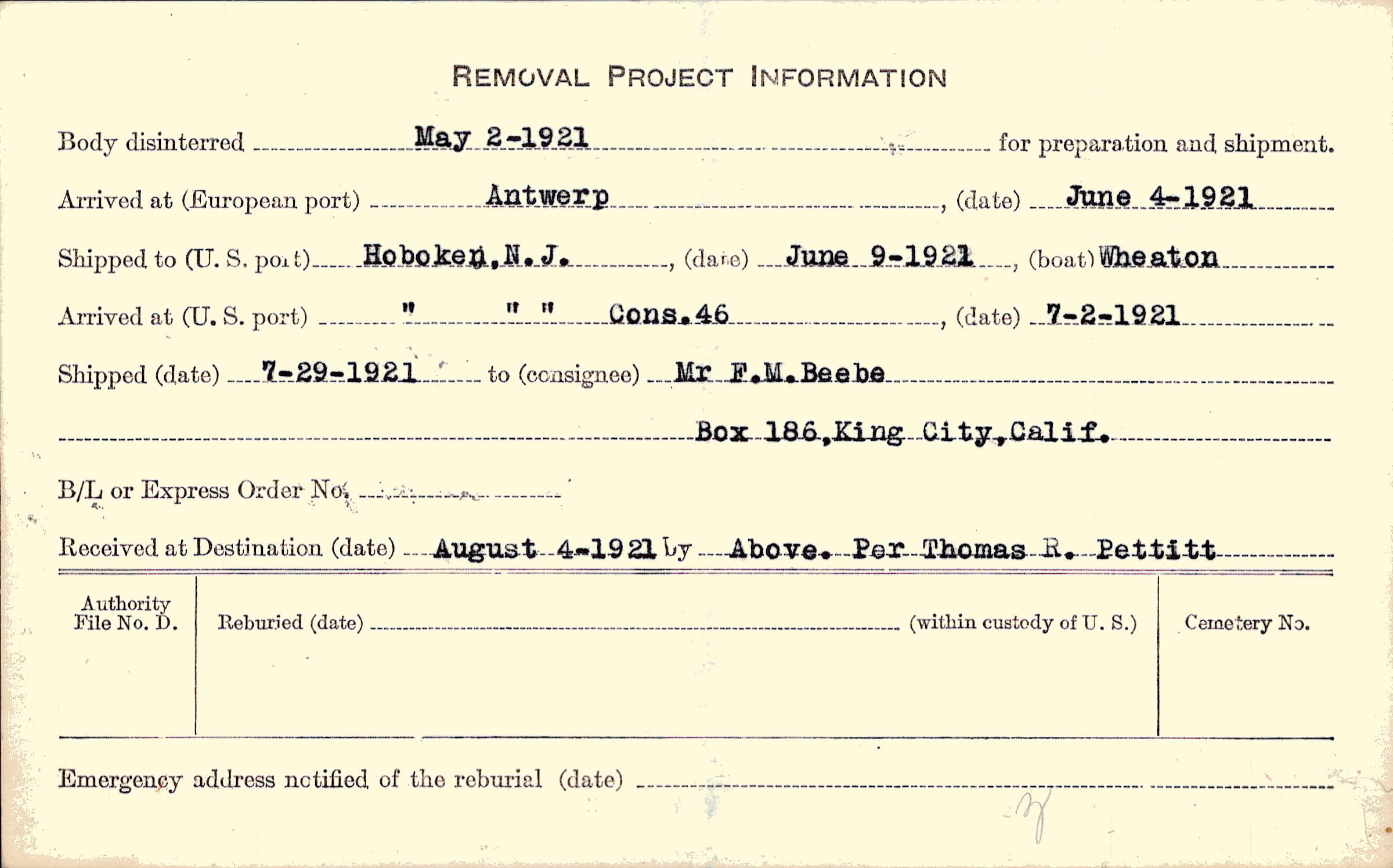 Body disinterred 5/2/1921 for preparation and shipment.
